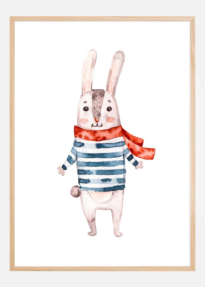 Denna charmiga poster porträtterar en gladlynt kanin klädd i en randig tröja och en fladdrande röd scarf. Kaninens varma leende och lekfulla hållning utstrålar glädje och oskuld, vilket skapar en hjärtlig och inbjudande känsla. Illustrationen, utförd i mjuka akvarelltoner, har en lätthet och en enkelhet som ger en berörande och nostalgisk effekt.