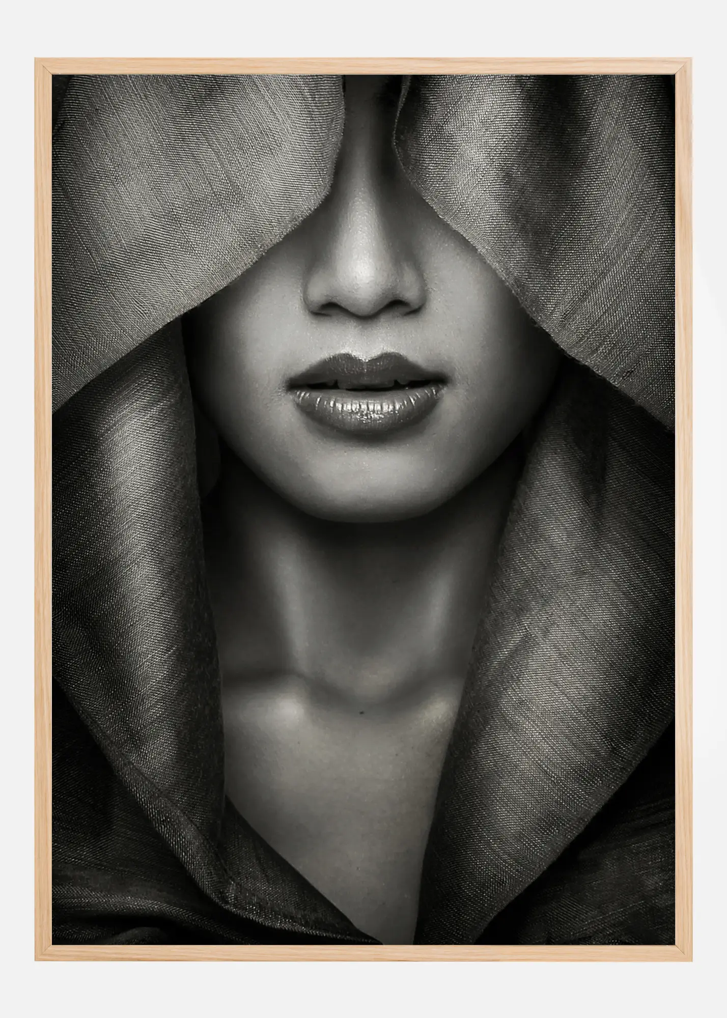Bilden skildrar en kraftfull och fängslande närbild av en person draperad i ett tyg, med fokus på de markerade läpparna och den starka käklinjen. Den detaljerade textureringen av tyget och de mjuka skuggorna på huden tillför en djup och komplexitet som drar betraktaren in i motivet. Den monokroma paletten framhäver varje detalj och skapar en tidlös känsla.