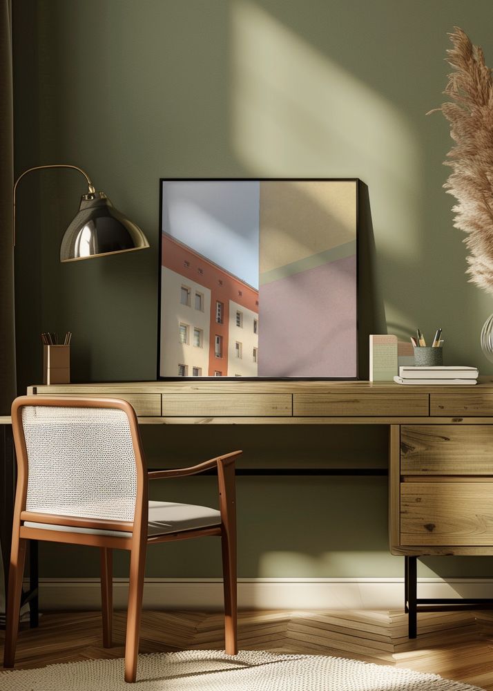 Denna poster kombinerar stilfull arkitektur med en modern, abstrakt touch. Bilden visar en byggnad med fasader i trendiga färger som rödbrunt, beige och krämvitt till vänster, samt en minimalistisk komposition med dova pasteller till höger. Det är en perfekt print för den som vill lägga till en mix av urbana och konstnärliga element i sitt hem.