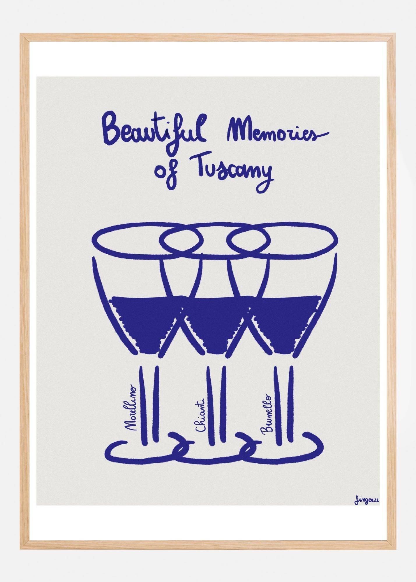 Denna stilfulla poster fångar essensen av "Beautiful Memories of Tuscany" med en modern och konstnärlig touch. Tre glas, enkla men eleganta, symboliserar minnesvärda stunder och inbjuder till reflektion och nostalgi. Denna affisch är ett perfekt komplement till alla rum som vill förmedla en känsla av lugn och sofistikation.