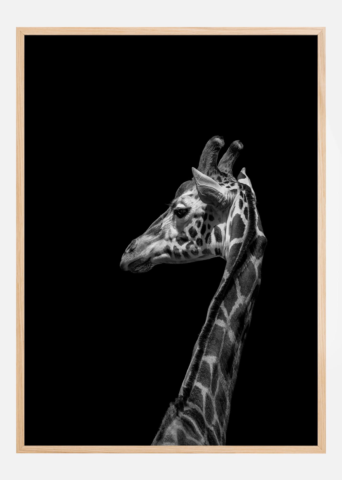 Denna djärva och uttrycksfulla poster presenterar en ståtlig giraff mot en kolsvart bakgrund, vilket skapar en dramatisk kontrast som fängslar betraktarens blick. Giraffens unika mönster i gråskala är skickligt fångade, med varje fläck och linje som framhävs i detalj. Detaljrikedomen i giraffens hudtextur och de mjuka nyanserna av grått mot den svarta bakgrunden ger en nästan tredimensionell effekt.