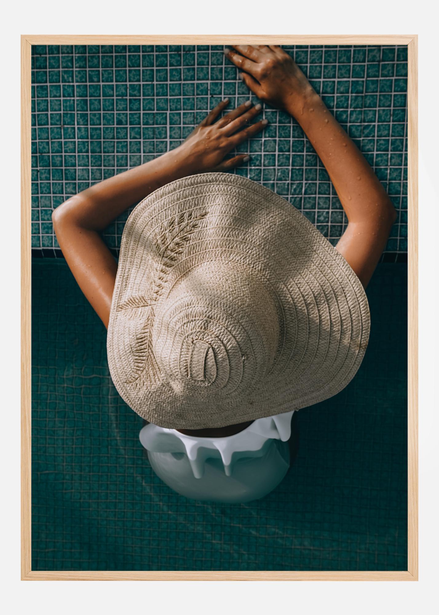 Denna avkopplande och eleganta poster fångar en fridfull stund vid poolen, där en person bär en bredbrättad hatt vilande vid vattenkanten. Den unika vyn från ovan och den lugnande blå mosaikbakgrunden ger en känsla av lyxig lätthet och sofistikering. Denna print är en underbar inredningsdetalj för att skapa en oas av lugn och avkoppling i ditt hem.
