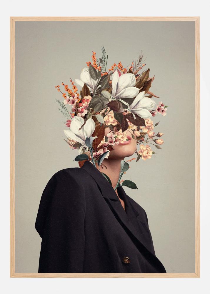 Utforska en fascinerande poster där modernt möter naturens skönhet. Denna print visar en stiliserad avbildning av en person vars ansikte ersatts av en blomsterbukett. Motivet uttrycker en fin balans mellan enkelhet och detaljrikedom, där blommor i olika former och storlekar prydligt arrangeras för att skapa en harmonisk bild. Affischen är perfekt för dig som vill ha en unik och tankeväckande konstnärlig touch i ditt hem eller kontorsutrymme.