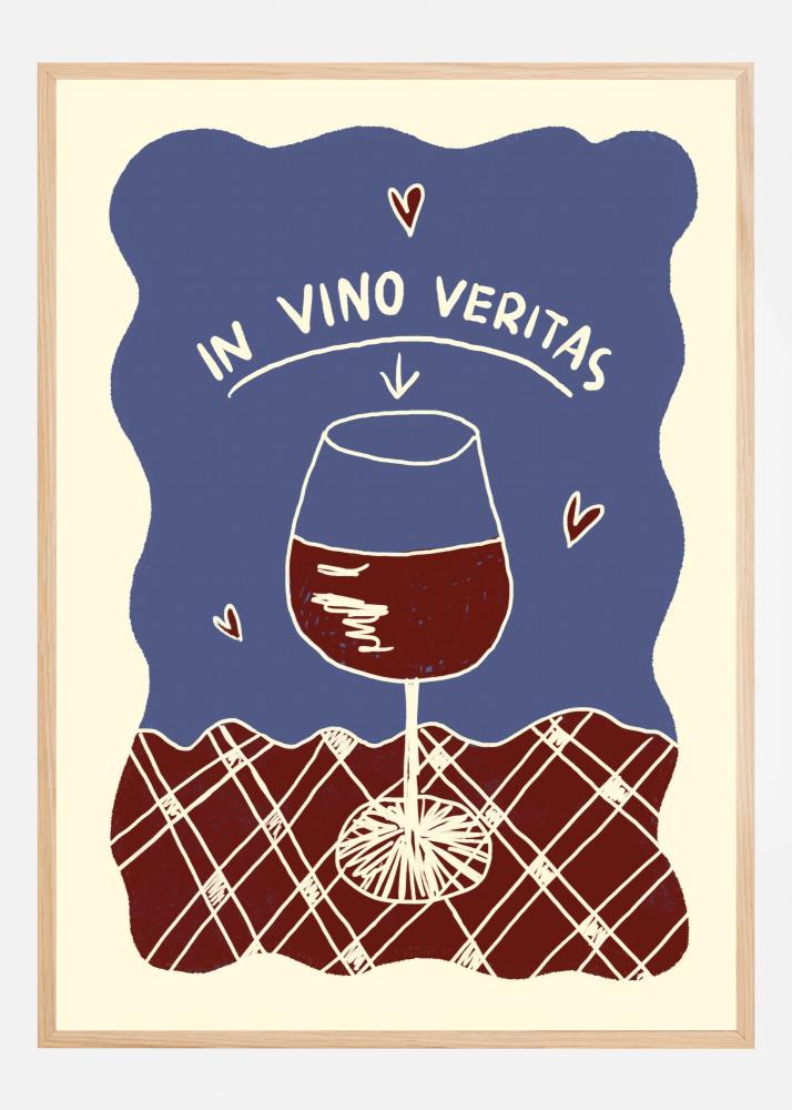 Denna poster erbjuder en stilren och trendig design med motivet av ett vinglas mot en djupblå bakgrund. Texten "In Vino Veritas" pryder postern och förmedlar en känsla av elegans och humor som passar perfekt i kök eller vardagsrum. De dekorativa hjärtan runt glaset förstärker den charmiga och lekfulla känslan i denna affisch.