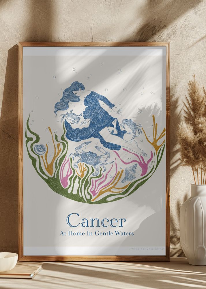 Denna vackra poster fångar essensen av det astrologiska tecknet Cancer, även kallat Kräftan, med ett konstnärligt och drömlikt motiv. Affischen visar en harmonisk scen där en person omgiven av vattenelement utforskar en värld av mjuka vågor och havsväxter. Den flytande känslan och de detaljerade illustrationerna skapar en lugnande atmosfär som perfekt kompletterar alla moderna heminredningar.