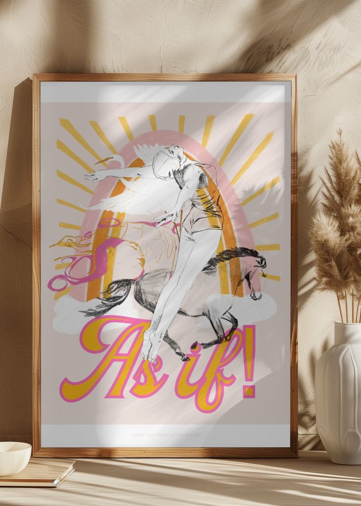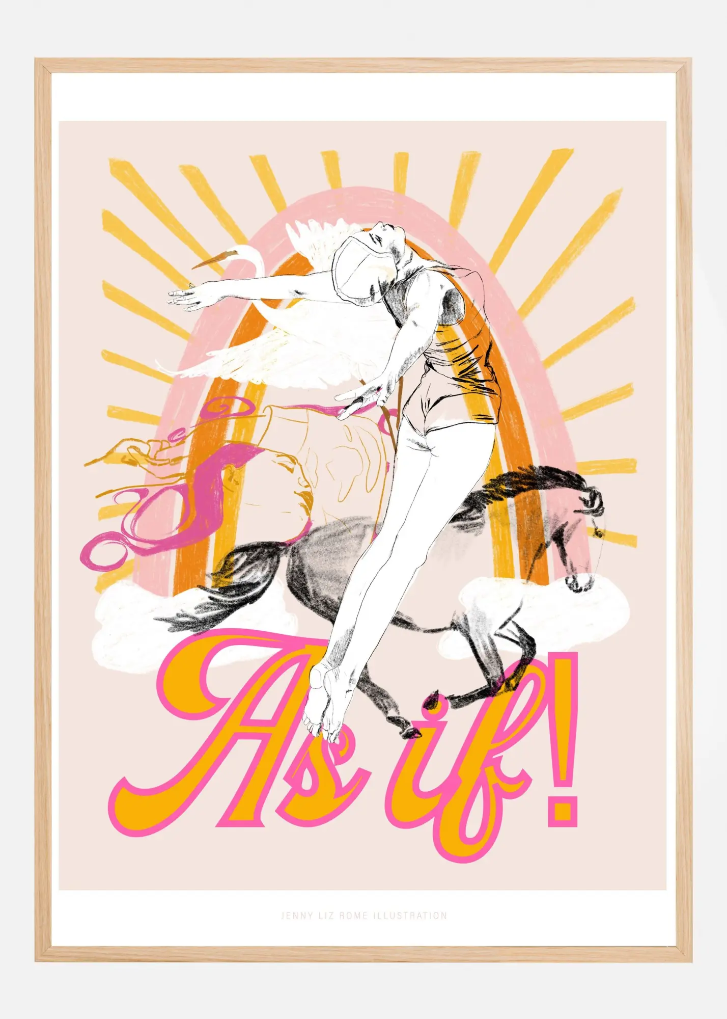Färgerna i denna print är levande och varierande, inklusive pastellrosa, djup svart, jordnära beige och ljus orange. Texten "As if!" i starkt rosa med gula konturer lägger till en modern touch och fångar ögat. En höjdpunkt för inredning där man vill ha en blandning av kreativitet och stil.