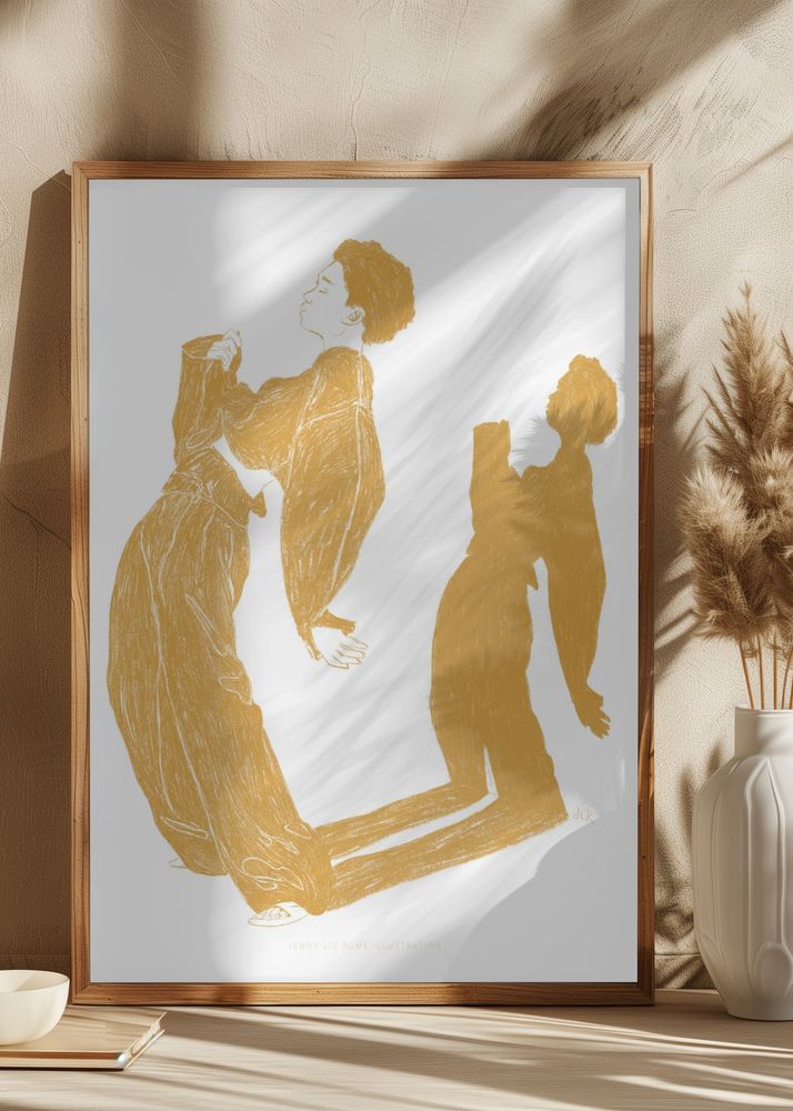 Denna konstnärliga poster fångar betraktarens uppmärksamhet med sin unika silhuett av en person i en böljande rörelse. Utförd i en varm senapsgul ton mot en klarvit bakgrund, skapar den en stilren och modern känsla som passar perfekt i både trendiga och klassiska miljöer. Bildens konturer och kontraster gör den till ett attraktivt val för dem som vill uttrycka sin konstnärliga smak genom affischer och prints.