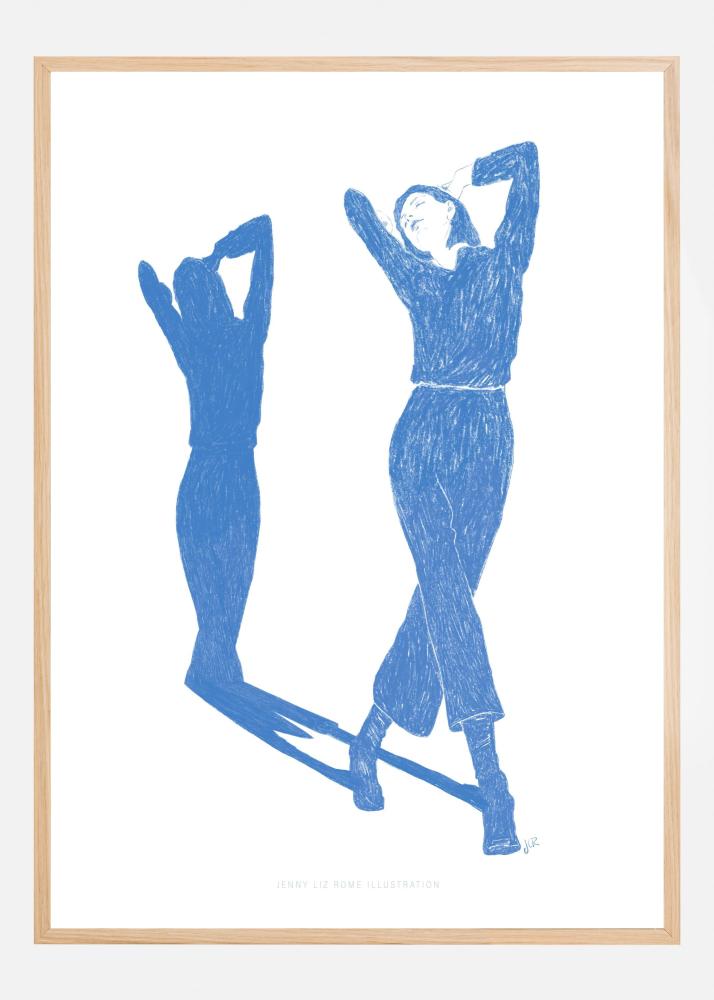 Denna moderna poster visar en stilren illustration av en kvinna i rörelse, där hennes siluett fångas i en elegant pose. Motivets minimalistiska stil och den intensiva blå färgen ger en kraftfull och samtidigt lugn känsla, vilket gör det perfekt för både moderna och klassiska interiörer. Det är en print som talar till betraktaren och väcker nyfikenhet med sin subtila men uttrycksfulla design.