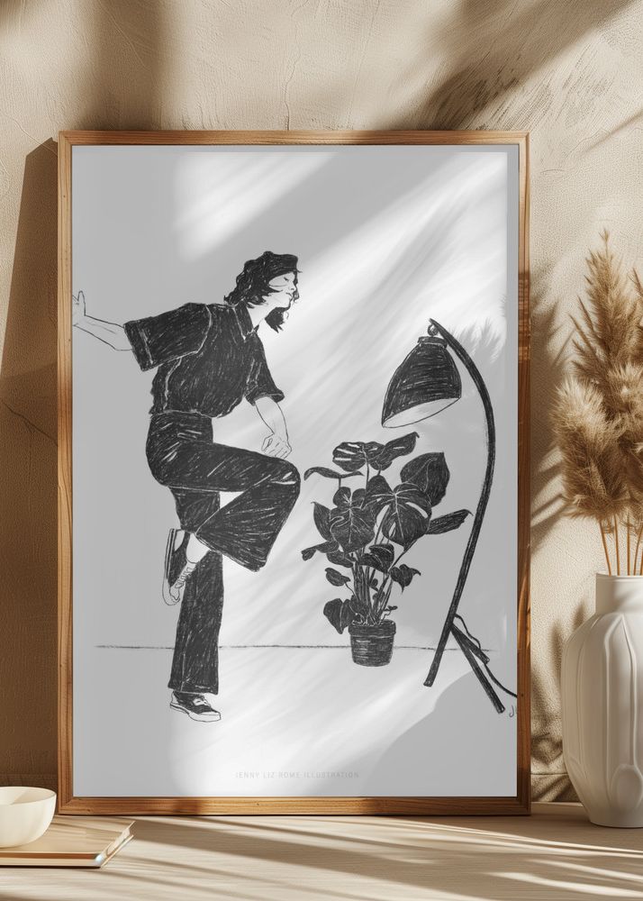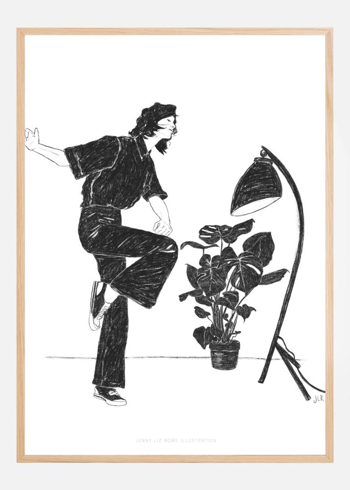 Denna stilrena poster fångar en unik mix av konst och modern design. Motivet illustrerar en person i en dynamisk pose, klädd i svart. Bredvid står en elegant golvlampa i en minimalistisk stil samt en krukväxt med livfulla blad. Denna affisch är perfekt för dig som vill inreda med en kombination av konstnärlig stil och modern estetik.