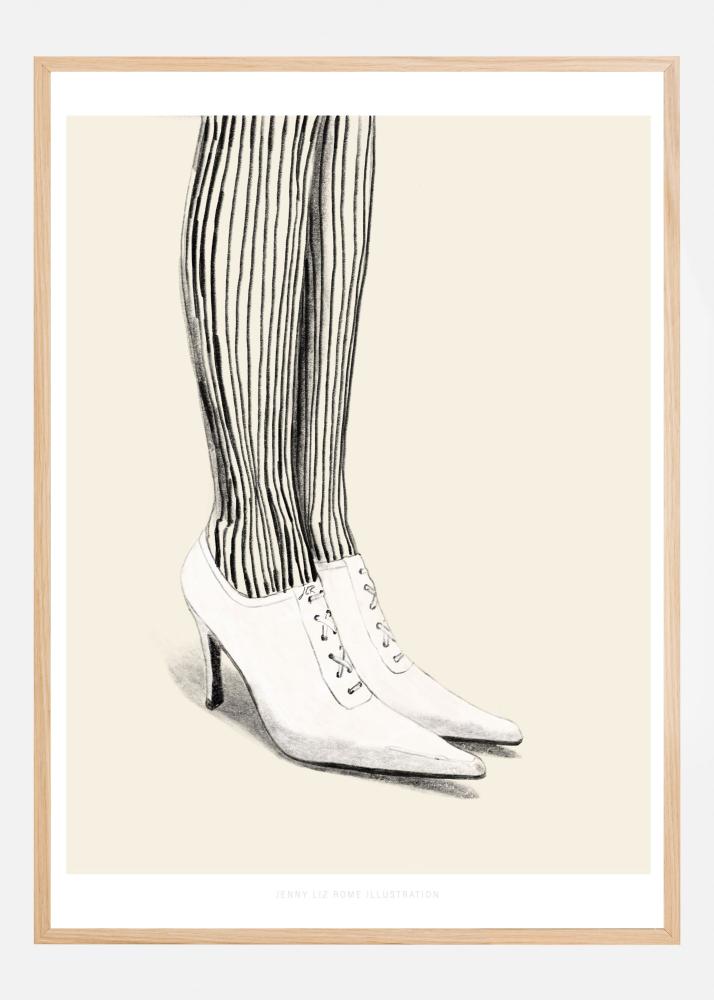 Denna stilrena poster fångar uppmärksamheten med sin minimalistiska illustration av ett par eleganta högklackade skor. Skorna bärs tillsammans med särskilt utmärkande, randiga strumpbyxor som ger motivet en modern och konstnärlig touch. Perfekt för att ge en känsla av sofistikerad stil till vilket rum som helst.