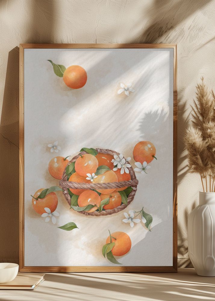 Denna poster fångar essensen av naturens skönhet med ett livligt motiv av apelsiner i en korg, omgiven av små vita blommor och gröna blad. Färgpaletten domineras av varma toner, där de livfulla orange färgerna från frukterna står i kontrast mot de rena vita blomstren och de friska gröna nyanserna från bladen.