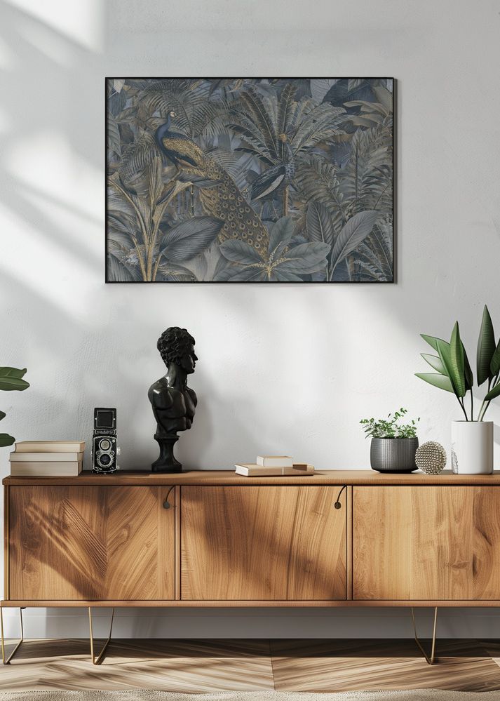 Denna eleganta poster fångar det majestätiska i naturen med ett detaljrikt motiv av påfåglar omgivna av lummiga växter. Perfekt för att tillföra en touch av exotisk skönhet till ditt hem. Affischen framhäver djurens stolta hållning och naturens frodiga grönska på ett imponerande sätt, vilket gör den till ett samtalsämne i vilket rum som helst.