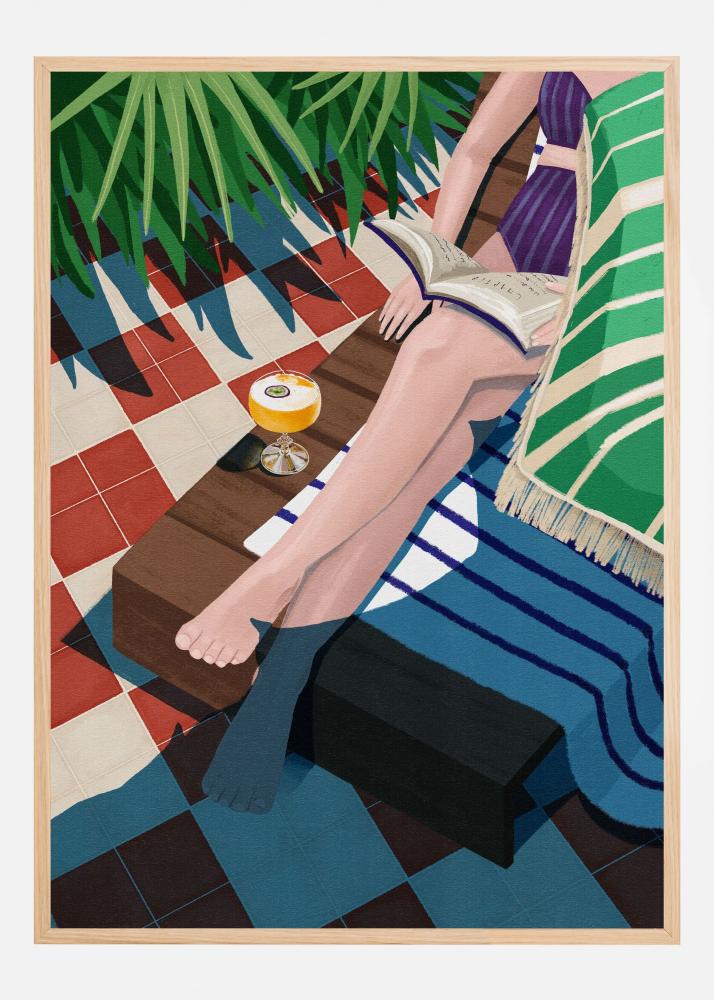Denna exklusiva affisch fångar en avslappnande sommarscen där en person sitter vid poolkanten med en uppslagen bok. En cocktailglas på bordet intill förstärker känslan av sommar och avkoppling. Affischen är ett perfekt tillskott till vilket rum som helst som behöver en touch av elegans och semesterstämning.