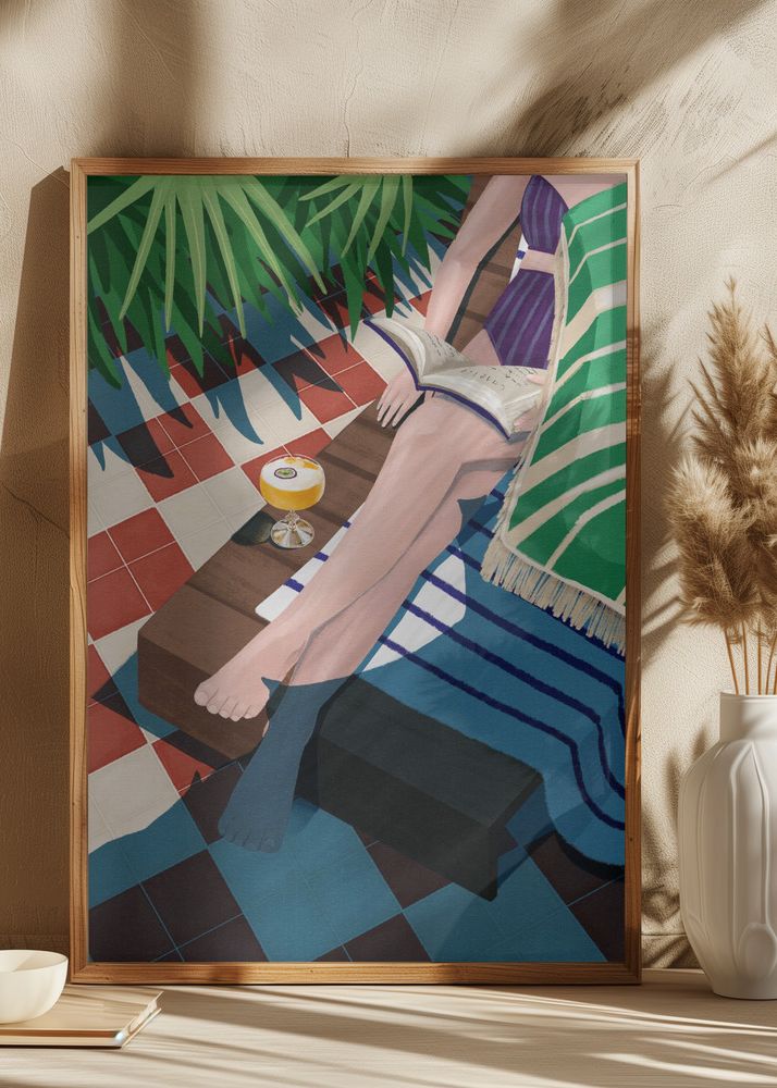 Denna exklusiva affisch fångar en avslappnande sommarscen där en person sitter vid poolkanten med en uppslagen bok. En cocktailglas på bordet intill förstärker känslan av sommar och avkoppling. Affischen är ett perfekt tillskott till vilket rum som helst som behöver en touch av elegans och semesterstämning.