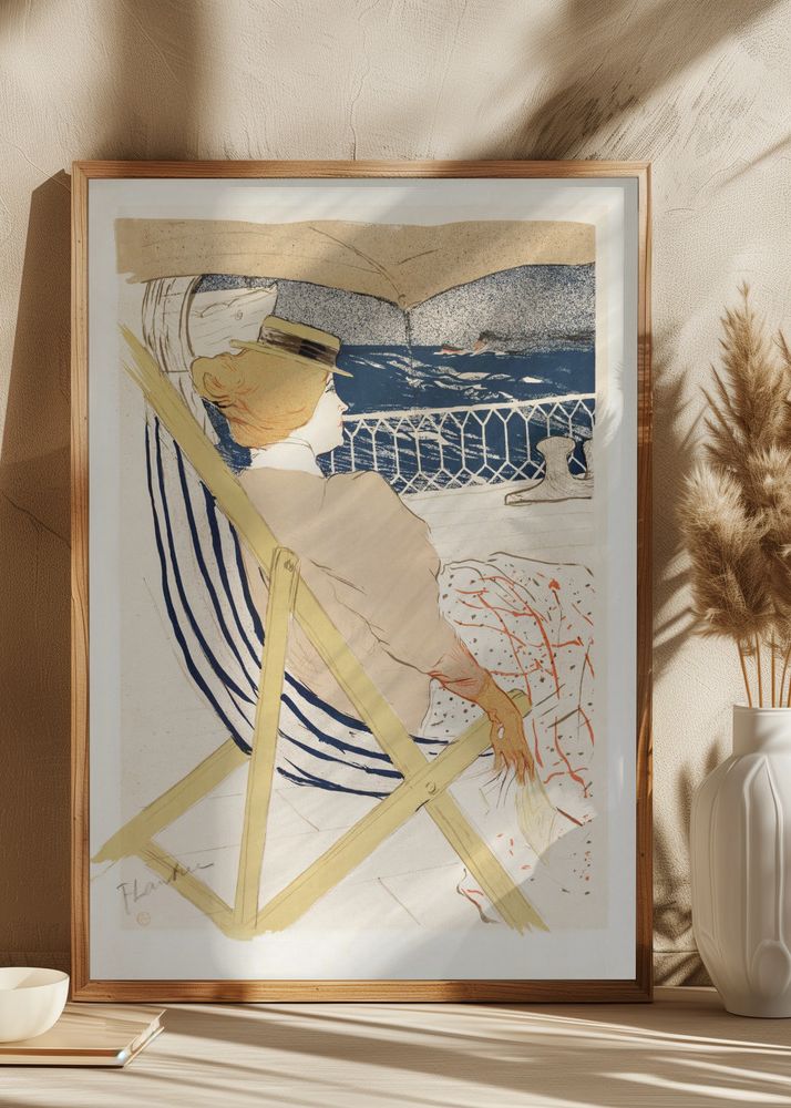Upptäck en stilfull poster som fångar essensen av en avkopplande dag vid havet. Motivet visar en person i en solstol med ryggen vänd mot betraktaren, vilket ger en känsla av lugn och introspektion. Denna print är perfekt för att skapa en sofistikerad atmosfär i alla rum, samtidigt som den bjuder in till drömmar om havsbrisen.
