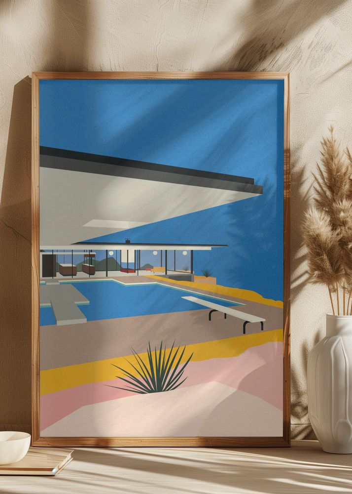 Den här moderna postern fångar essensen av arkitektonisk minimalism med ett stilrent motiv av ett ikoniskt hus vid en pool. De rena linjerna och den avskalade designen skapar en känsla av lugn och elegans. Perfekt för den som söker en stilfull affisch att förgylla sitt hem med, och som samtidigt skapar en tidlös atmosfär.