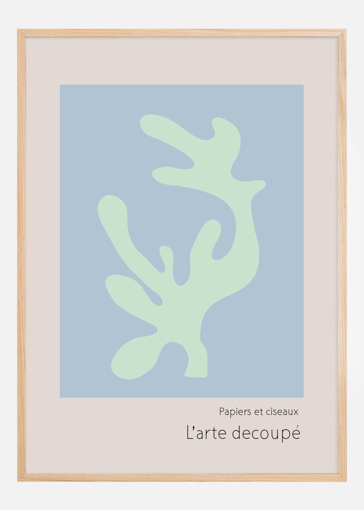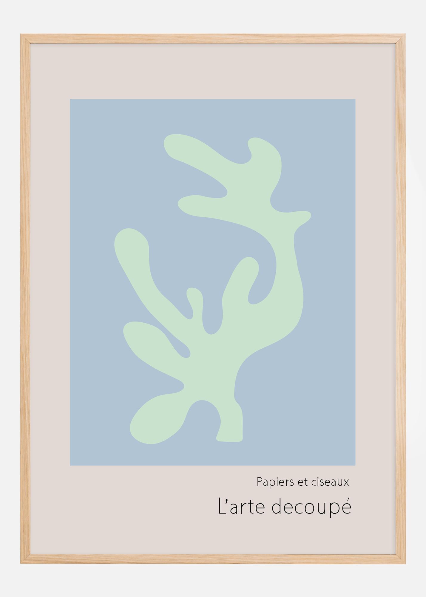 Denna sofistikerade och minimalistiska poster hyllar 'L'arte decoupé', konsten att skära i papper, vilket är en elegant och tidlös form av konstnärligt uttryck. Den avbildar en abstrakt form i en lugnande pastellgrön nyans som svävar på en mjuk blå bakgrund, vilket ger en illusion av lätthet och flyktighet. Den enkla formen, som är både organisk och öppen för tolkning, inbjuder betraktaren att utforska de negativa rymderna och hitta sin egen mening i det skurna mönstret.