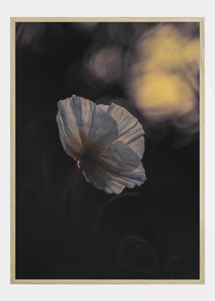 Denna poster fångar essensen av en stillsam skymning med en enstaka vallmo i förgrunden som belyses av de sista strålarna från en solnedgång. Blomman är delikat och detaljerad, dess kronblad i en ljus, nästan genomskinlig nyans av vit och ljusblått som står i kontrast mot den varma, suddiga bakgrunden av solnedgången i nyanser av orange och brunt.