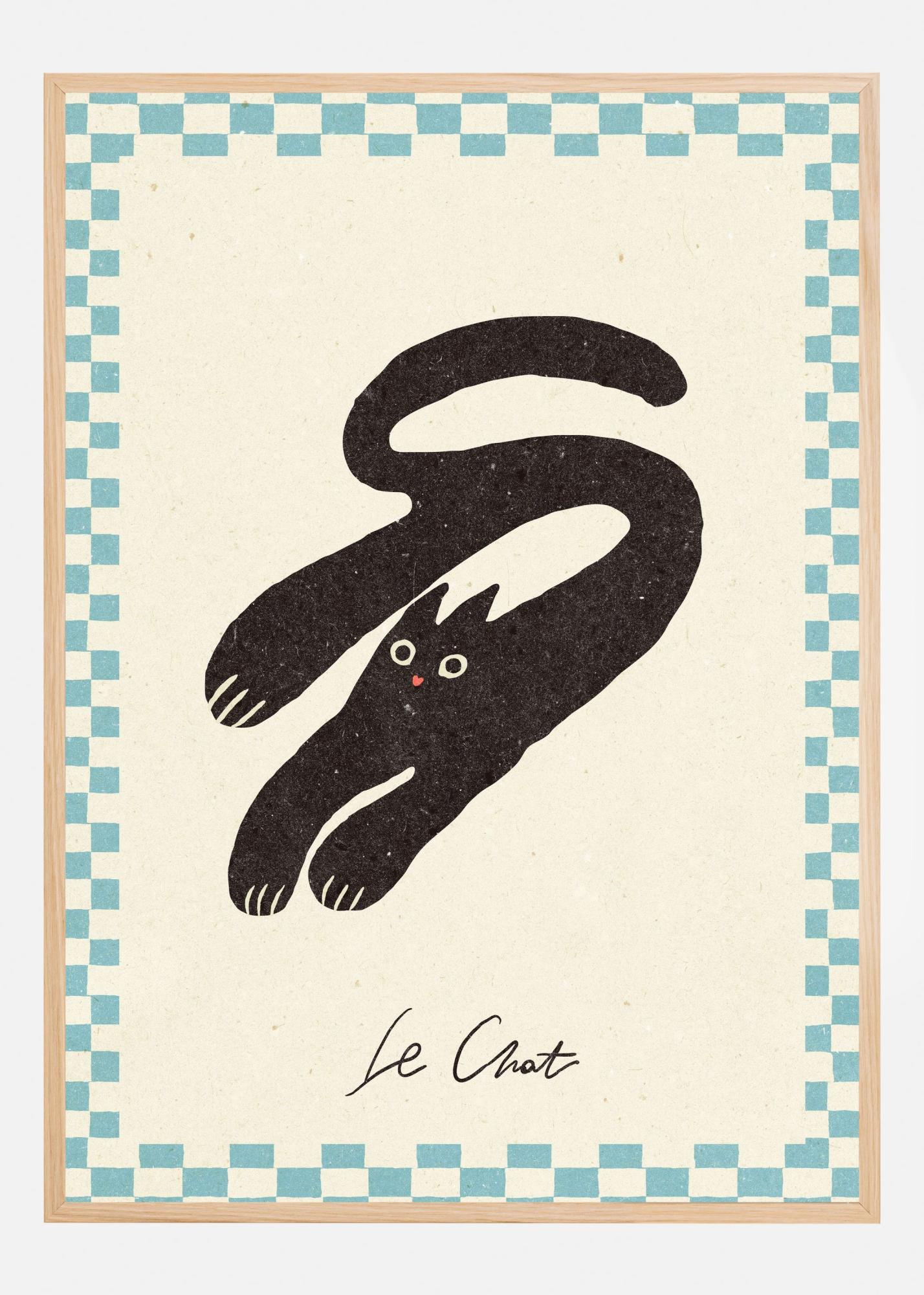 Färgpaletten i denna print består av en djup svart färg i kattens kropp, kontrasterande mot en mjuk beige bakgrund. De blå rutorna längs kanten tillför en fräsch färgklick som kompletterar motivets enkelhet och elegans. Texten "Le Chat" ger en sofistikerad touch som förstärker hela affischens charm och stil. Perfekt för att ge liv åt alla väggar med en trendig och konstnärlig känsla.