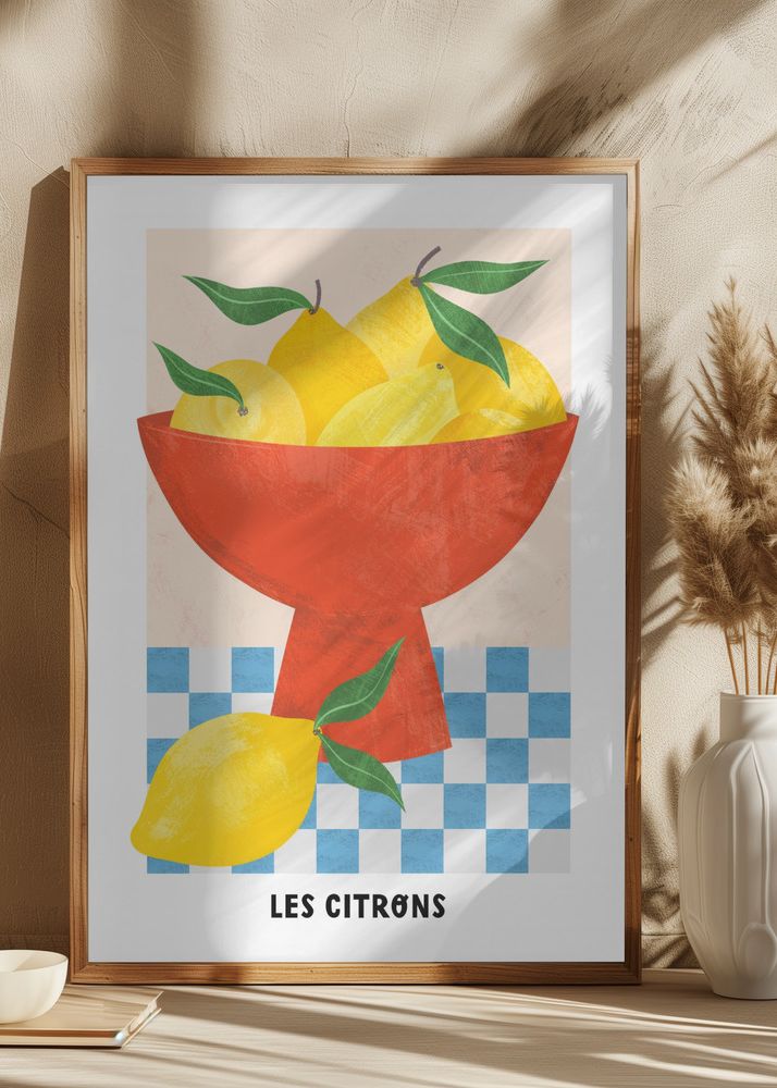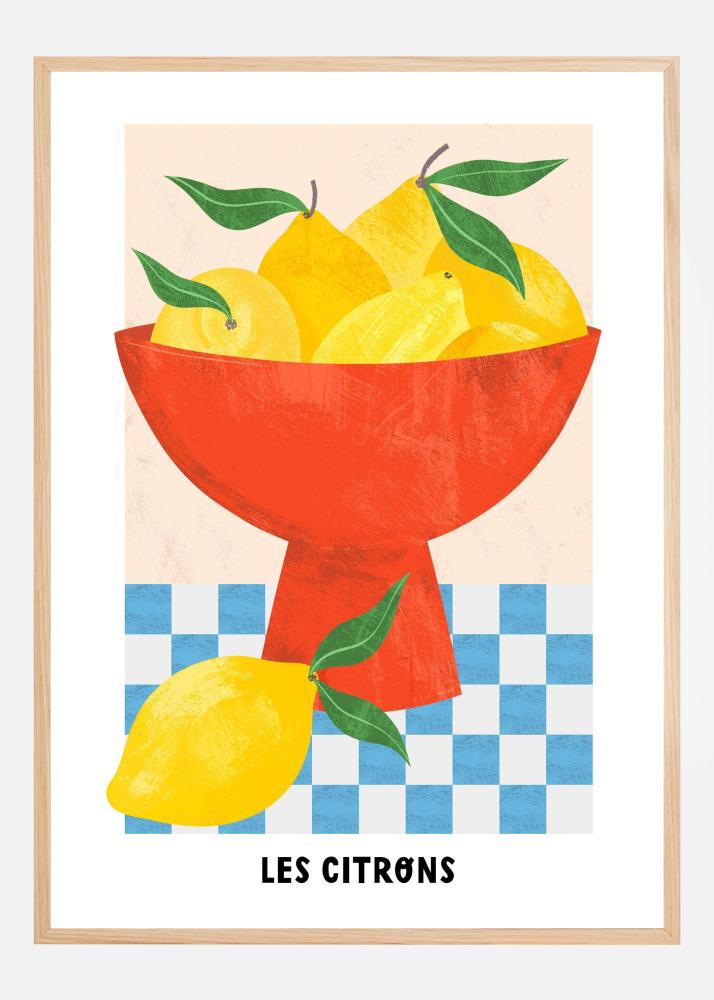 Denna färgglada affisch fångar ögat med sina livliga och energigivande färger. På motivet ser vi en stiliserad skål fylld med klargula citroner, vilket ger en fräsch och solig känsla till rummet. Skålen har en intensiv röd nyans som skapar en vacker kontrast mot citronerna, medan de gröna bladen ger en naturlig och harmonisk accent. Texten "Les Citrons" längst ner tillför en charmig touch och förstärker affischens moderna estetik.