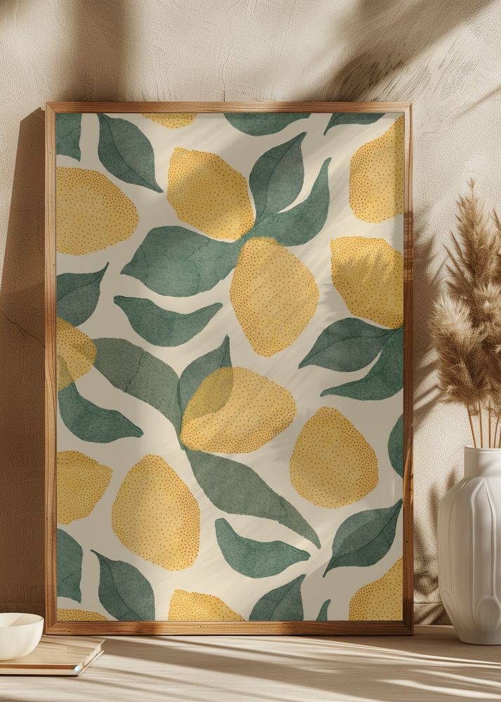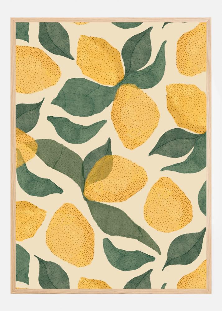 Färgpaletten består av varma gula nyanser som framhäver citronernas naturliga toner, medan de gröna bladen adderar en mjuk kontrast. Denna poster passar lika bra i köket som i vardagsrummet och blir en riktig blickfångare på din vägg.