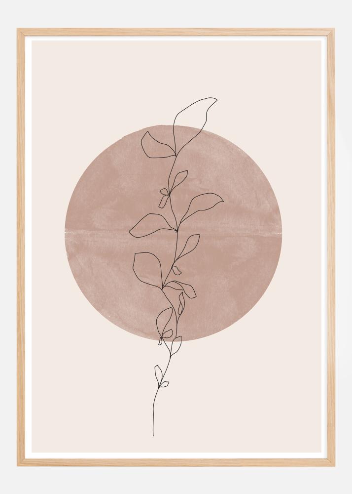 Denna poster framställer en delikat linjeillustration av en blommande kvist, vars konturer spelar mot en stor, målat cirkel i en lugnande, jordnära nyans. Kontrasten mellan det minimala blomstermotivet och den kraftfulla bakgrundsfärgen skapar en intressant dynamik som är både lugnande och estetiskt tilltalande.