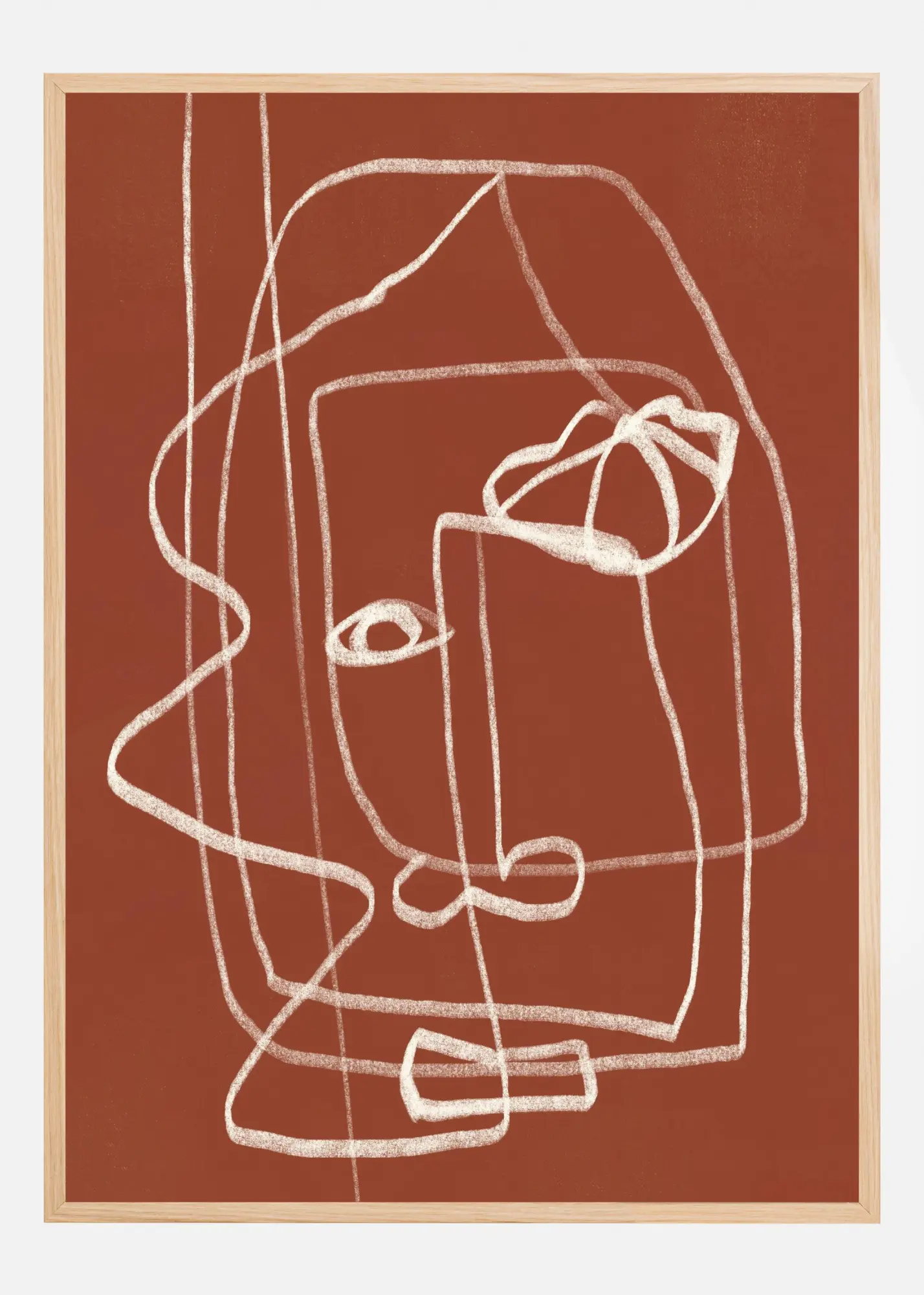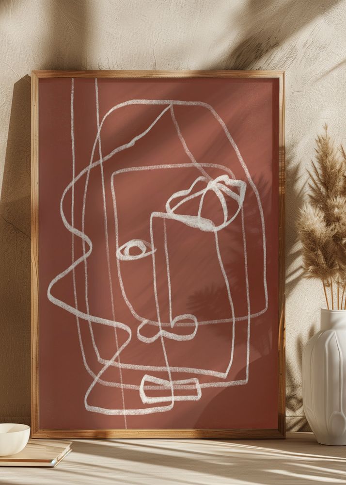 Den här moderna postern visar ett stilrent line art-motiv med abstrakt ansikte mot en djup terrakottabrun bakgrund. De vita linjerna skapar en minimalistisk och stilfull design som fångar ögat och adderar en känsla av modern konst till ditt hem. Idealisk som print för den som söker efter ett samtida uttryck eller en unik affisch att förgylla rummet med.