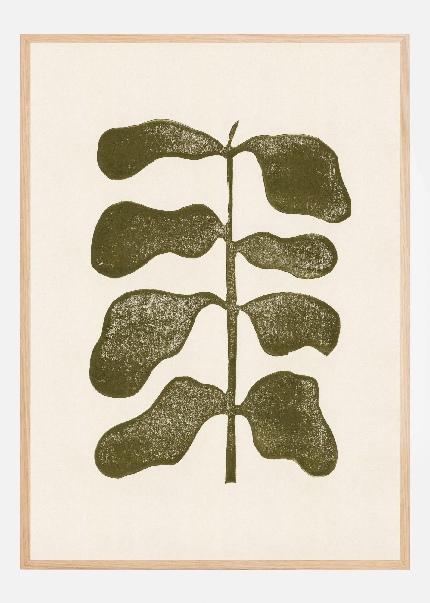 Motivet har en djupt olivgrön färg som kontrasterar mot den ljusa bakgrunden, vilket framhäver formernas detaljer. Denna färgpalett gör att printen enkelt kan kombineras med både neutrala och färgstarka omgivningar. En idealisk affisch för den som söker ett sofistikerat tillskott till väggarna.