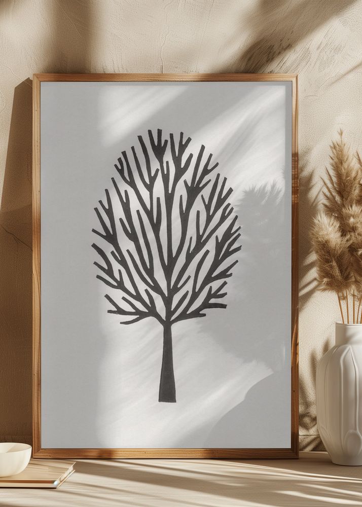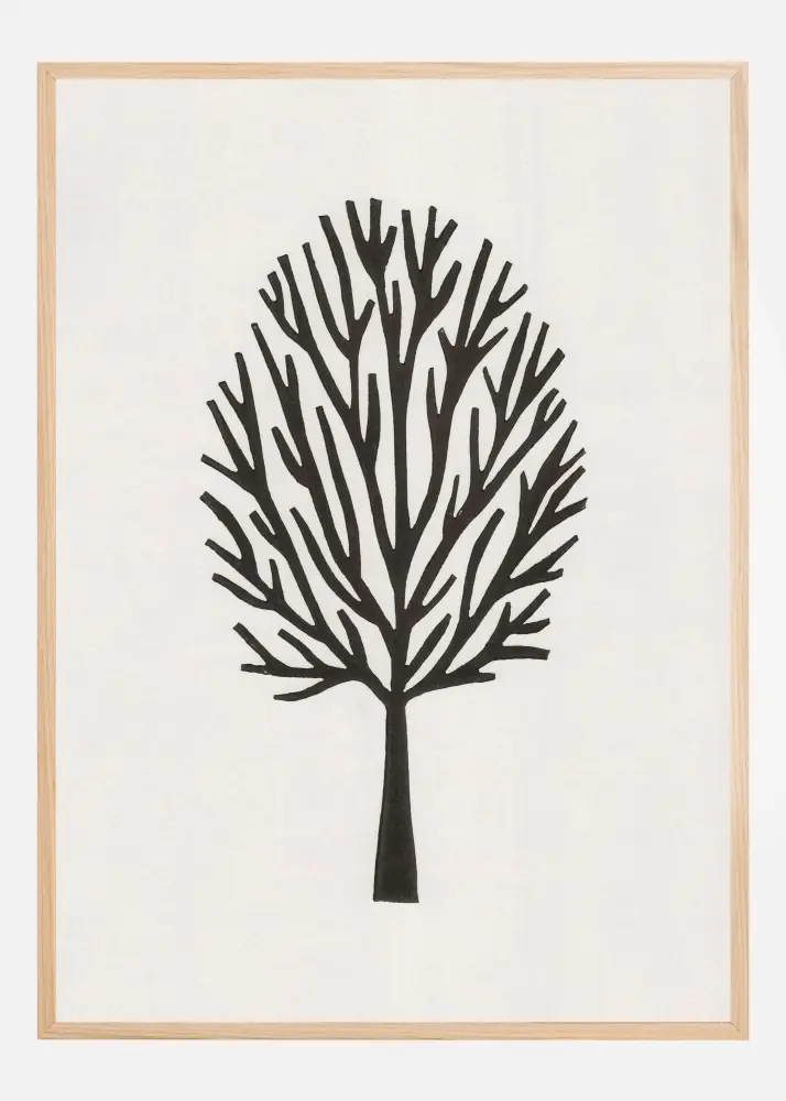 Denna affisch erbjuder en elegant och minimalistisk illustration av ett träd med svartvita linjer. Trädets grenar är stilrent avbildade mot en ljus bakgrund, vilket ger en modern känsla. Perfekt för den som söker en tidlös och stilren poster att pryda sina väggar med, oavsett inredningsstil.