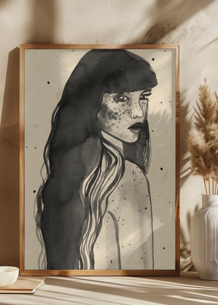 Denna poster fångar ett konstnärligt porträtt av en person med långt, böljande hår som framhävs i en monokrom färgpalett. Med fokus på eleganta skuggor och kontraster skapar detta print ett djärvt och tidlöst uttryck. De svarta detaljerna mot den ljusare bakgrunden ger affischen en sofistikerad känsla, perfekt för att sätta en stilren prägel i ditt hem.