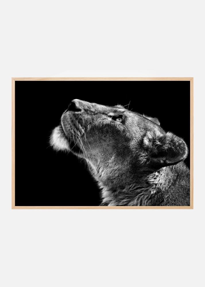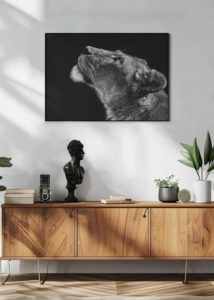 Denna eleganta poster fångar en ståtlig lejoninna i profil mot en djup, svart bakgrund. Med sin intensiva blick och detaljerade päls, bjuder detta motiv in till en känsla av styrka och skönhet. Perfekt för att tillföra en dramatisk touch till vilken vägg som helst i ditt hem eller kontor.