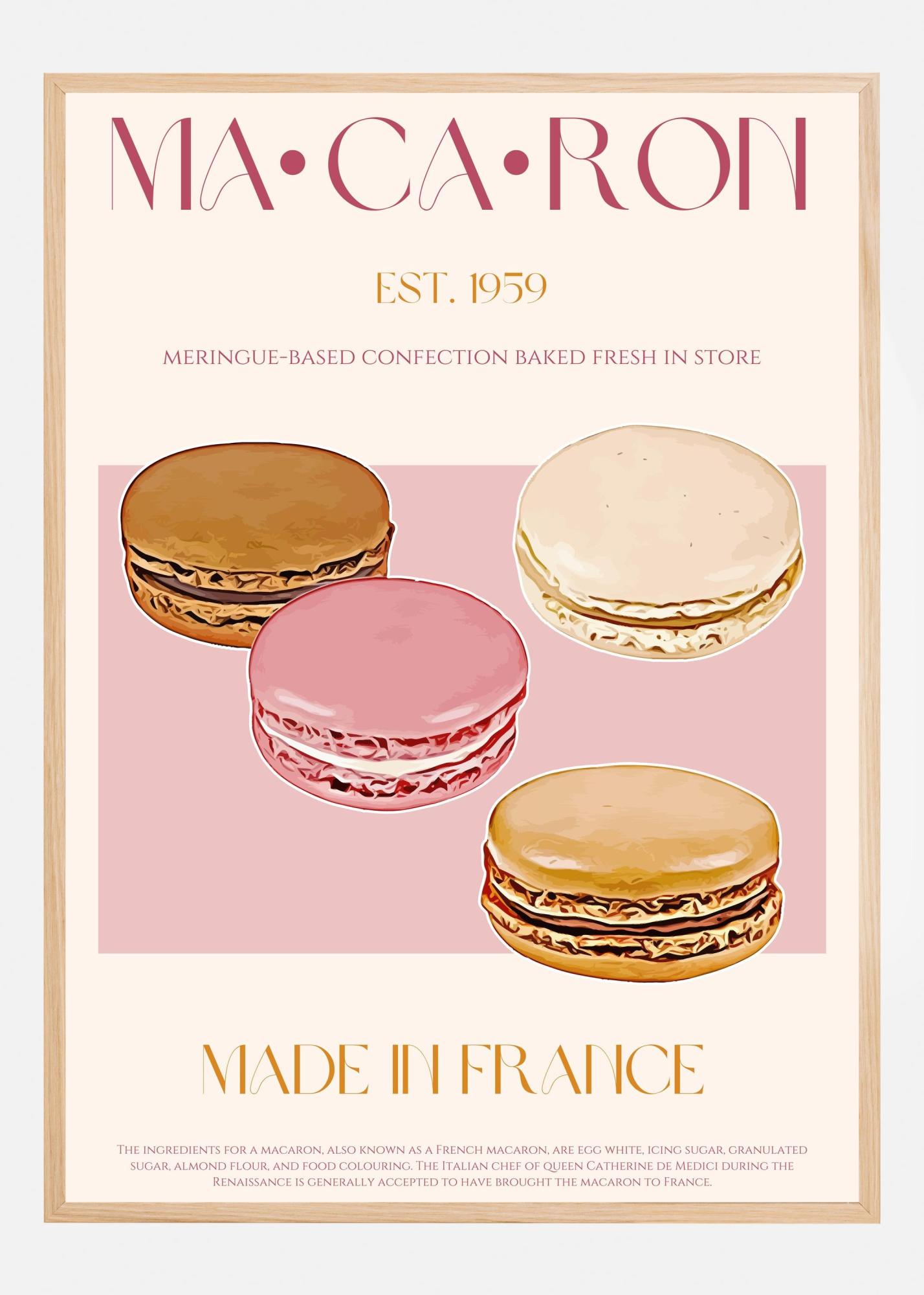 Denna eleganta poster fångar kärnan av franska delikatesser med illustrationer av fyra makroner i en stilfull och modern design. Perfekt för köket eller caféet, denna print visar makroner i olika läckra nyanser: chokladbrun, jordgubbrosa, krämvit och honungsgul. Denna affisch är ett uttryck för både klassisk och samtida stil, vilket gör den till ett iögonfallande tillskott i alla hem eller arbetsmiljöer.