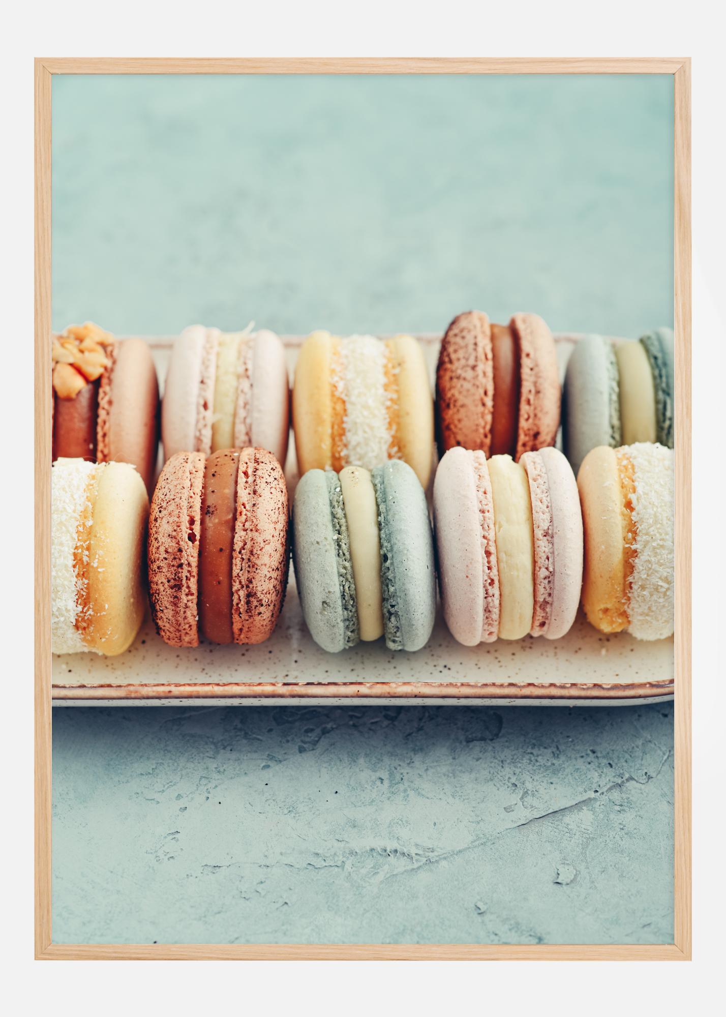 Denna färgrika och aptitretande poster framställer en rad delikat ordnade macarons, vars varierande färger och texturer skapar en visuell fest. De mjuka pastellfärgerna spänner från blek citron till rik karamell och pudrigt rosa, varje macaron är accentuerad med detaljer som strössel och kokosflingor, vilket förhöjer dess utseende och förmodade smak.