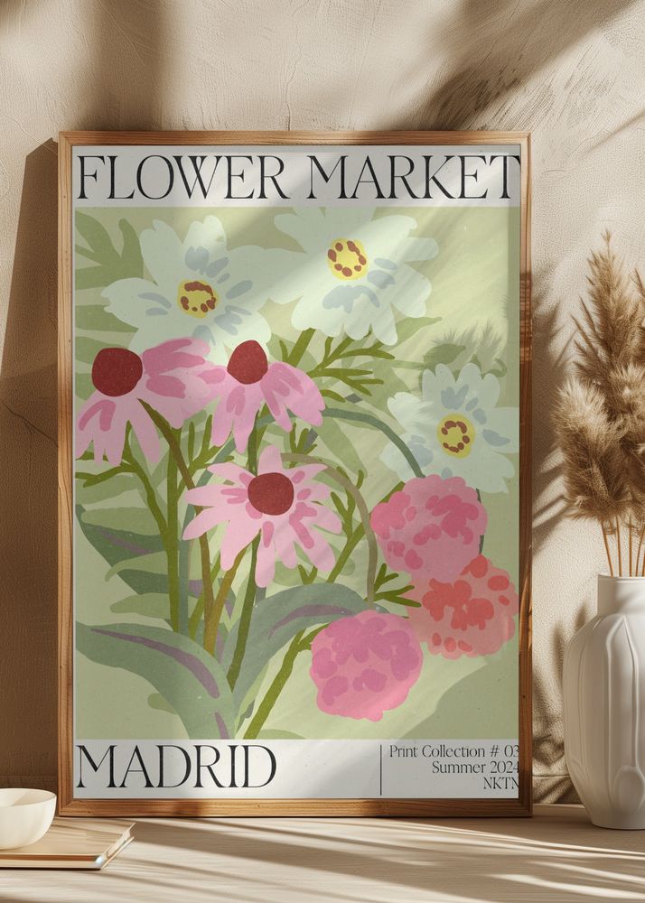 Denna poster bjuder på en härlig sommarkänsla med ett livfullt blomsterarrangemang. Motivet är en blandning av färgglada blommor, där rosa, röda och vita toner dominerar bland de gröna bladen. Posterdesignen fångar den vibranta energin från en blommarknad i Madrid, vilket gör den till ett perfekt tillskott för att ljusa upp vilken vägg som helst. Låt denna affisch bli en del av din inredning och tillför en känsla av natur och kreativitet i ditt hem.