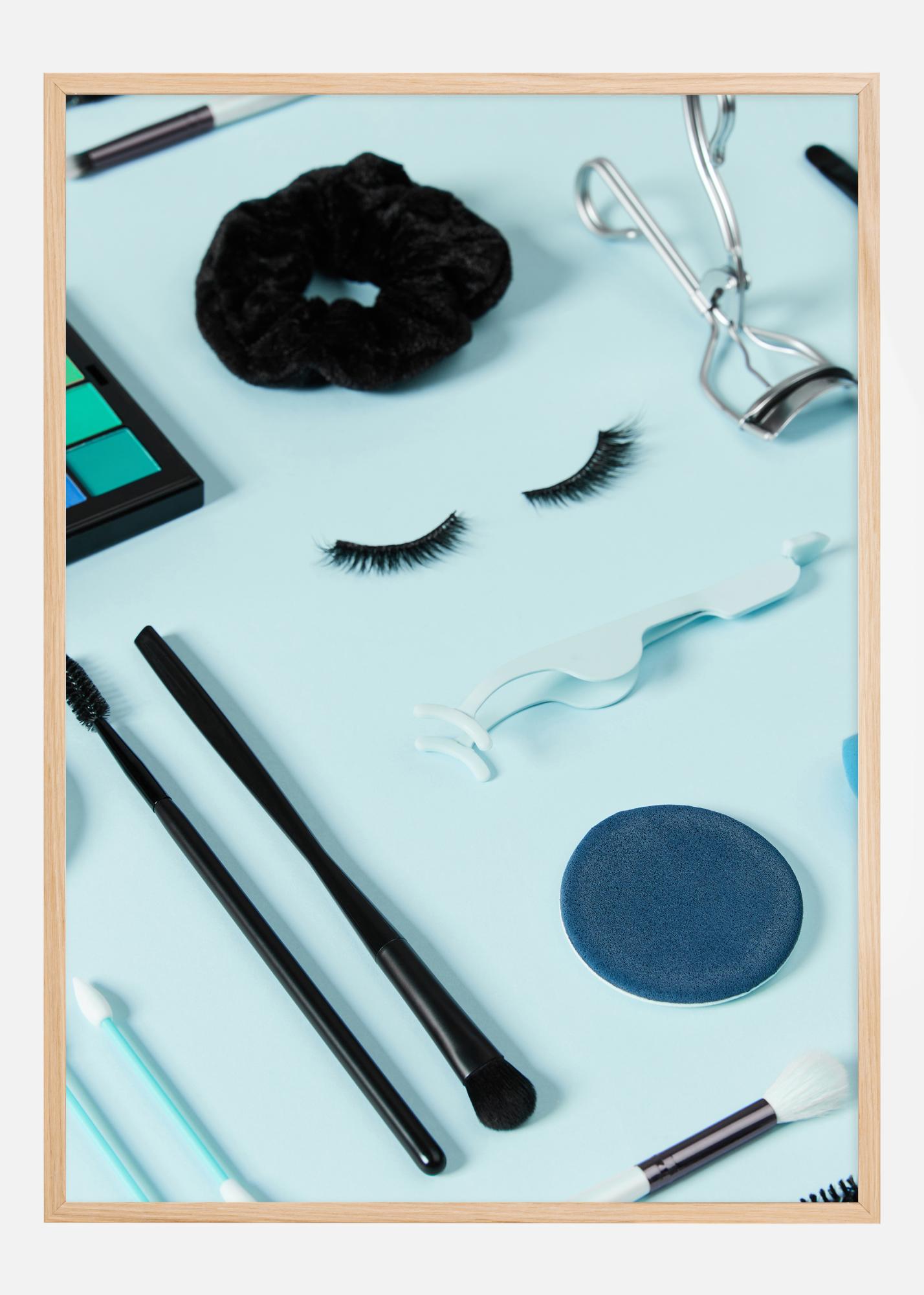 Färgpaletten domineras av mjuka och lugnande blå nyanser som kompletteras av svart och silver, vilket ger en fräsch och samtida look. De realistiska detaljerna i makeupborstarna, ögonfransböjaren och lösögonfransarna kontrasterar vackert mot den minimalistiska bakgrunden, och den svarta hårsnoddens struktur ger ett intressant visuellt element. Denna print kommer att vara ett utmärkt tillägg till badrummet, sminkbordet eller någon plats där skönhet och stil är av största vikt. Den är perfekt för att inspirera och förgylla din dagliga skönhetsritual.