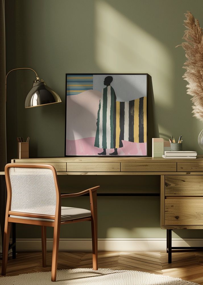 Den här moderna postern visar en elegant siluett av en person klädd i en klänning med vertikala ränder. Motivet erbjuder ett kontrasterande spel av färger, med breda ränder i grönt, beige, gult och svart som ger en dynamisk och stilren känsla. Bakgrunden är enkelt komponerad med block av ljust rosa och mjukt beige som förstärker siluetten och dess färgrika dräkt. Detta konstverk skapar en balanserad harmoni som drar blickarna till sig.