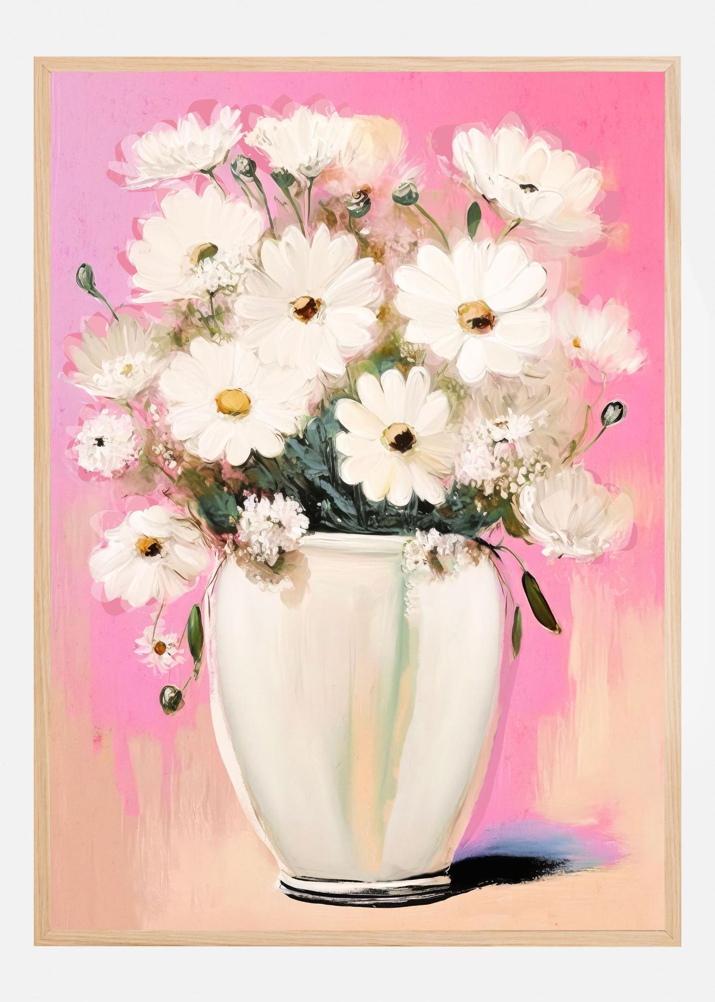 Färgerna i denna print består av mjuka, harmoniska nyanser. De vita blommorna kontrasterar mot en livfull rosa bakgrund med inslag av beige och ljusbruna toner, vilket ger bilden en varm och inbjudande känsla. Denna affisch är perfekt för att lysa upp och ge liv åt en vägg, samtidigt som den behåller en avslappnad och elegant atmosfär.