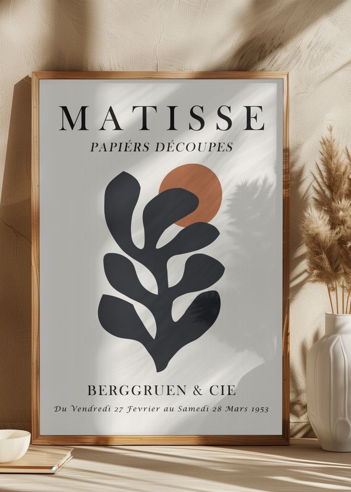 Upptäck elegansen i vår minimalistiska poster som hyllar konsten av Henri Matisse. Denna affisch avbildar ett stilrent motiv med en djärv, svart växtliknande form mot en krämvit bakgrund. Den klara designen fångar blickar och tillför en sofistikerad touch till vilket rum som helst.