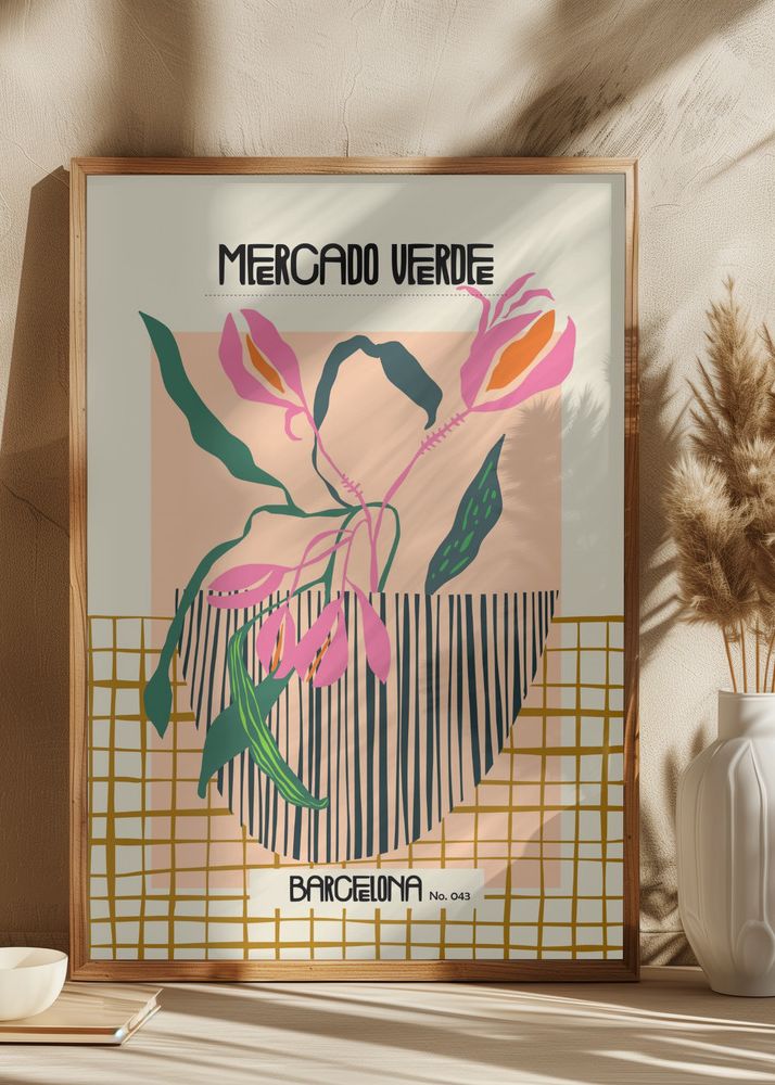 Denna eleganta poster föreställer ett konstnärligt arrangemang av exotiska blommor, som fångar essensen av natur och design. Med djärva, stiliserade linjer och former skapar denna print en modern och stilfull estetik som passar perfekt in i alla hem. Dess unika motiv förmedlar känslan av en konstnärlig marknad i hjärtat av Barcelona, vilket gör den till ett utmärkt samtalsämne.