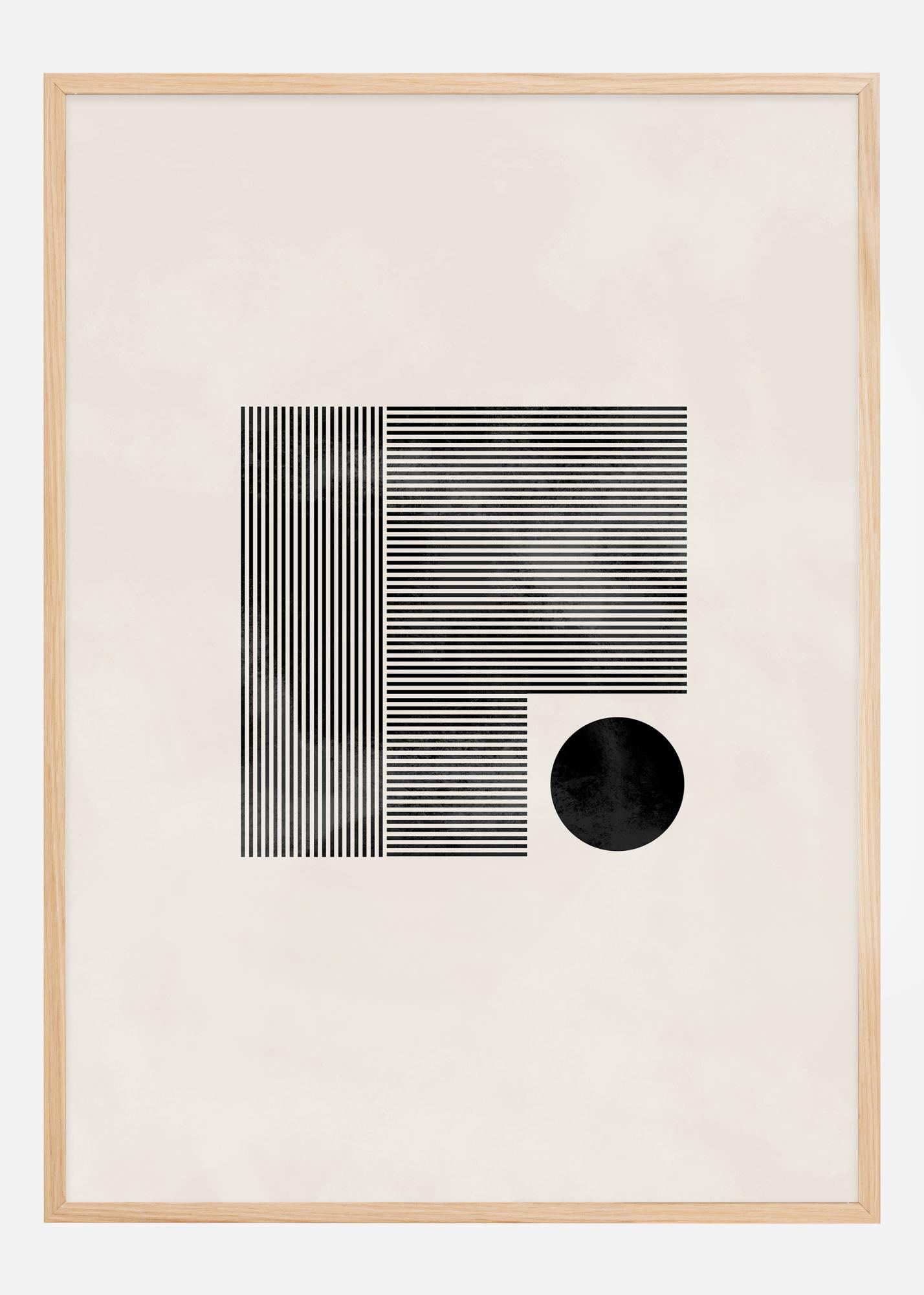 Denna stilrena och minimalistiska affisch framställer ett geometriskt spel mellan rektanglar och en cirkel, alla skildrade i djärva svarta linjer och former mot en mjuk, krämfärgad bakgrund. Den strama kompositionen av linjerna i rektanglarna ger en känsla av ordning och struktur, medan den ensamma svarta cirkeln bryter av och introducerar en oregelbundenhet som skapar visuellt intresse och balans. Detta är en konstverk som kan uppskattas för sin enkelhet och sin förmåga att komplettera en mängd inredningsstilar.
