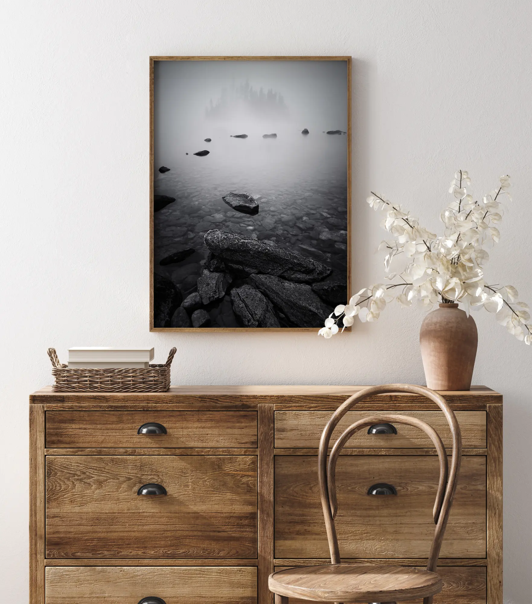 En mystisk naturposter med stenar och en dimmig sjö. Föreställ dig vad som finns där ute när du tittar på den dimmiga trädtäckta ön. Gör ditt hem magiskt med detta fantastiska tryck på en blå vägg.
