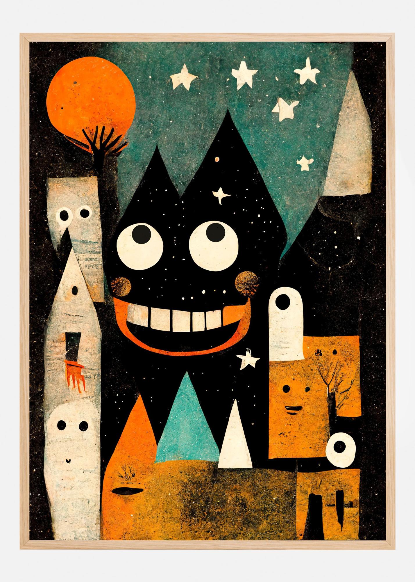 Denna affisch fångar en lekfull och fantasifull värld med sina livfulla och uttrycksfulla motiv. Postern domineras av en stor, leende figur med runda ögon i centrum, omgiven av olika geometriska former och glada element. De fantasirika karaktärerna och symbolerna ger ett unikt och konstnärligt intryck, perfekt för att skapa en kreativ atmosfär i vilket rum som helst.