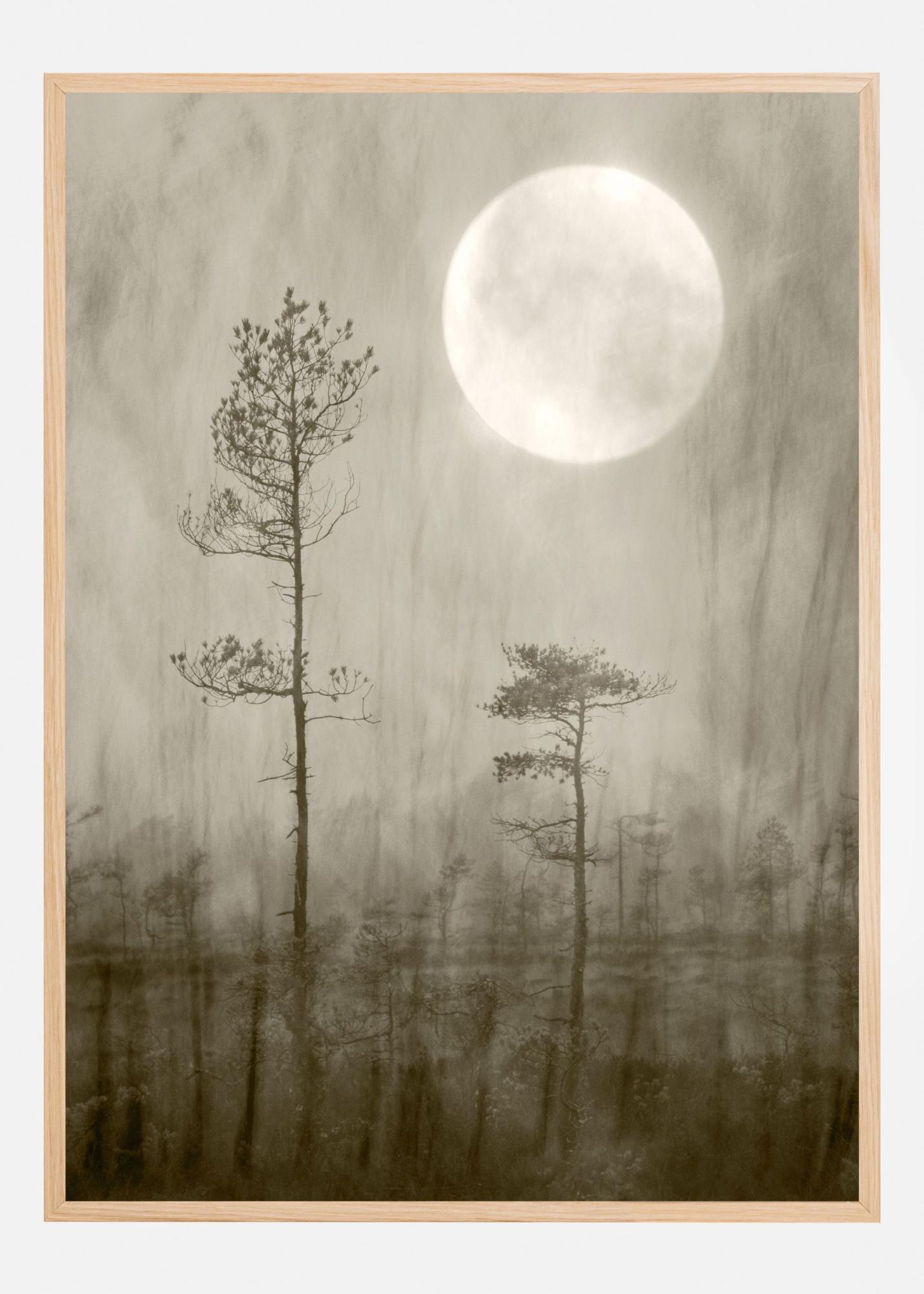 Denna affisch fångar en mystisk och lugnande skogsscen med höga träd som sträcker sig mot en ljus, full måne. Motivet ger en drömlik känsla där dimma vilar varsamt över landskapet. Perfekt som print för dem som söker harmoniska och naturnära inslag i sin inredning.