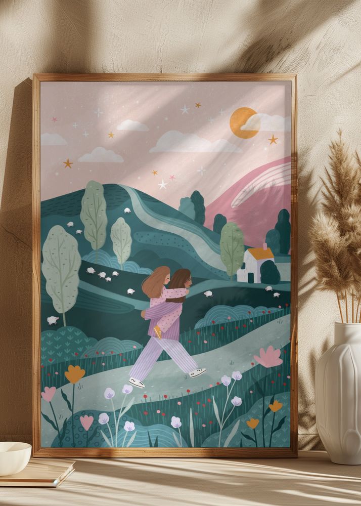 Denna poster är en härlig illustration som fångar ett idylliskt landskap i ett sagolikt kvällsljus. Två personer promenerar kärleksfullt hand i hand längs en slingrande stig omgiven av frodig natur. De mjuka, böljande kullarna är rika på gröna och turkosa färgtoner, med vita får som betar och fläckar av pastellrosa stjärnor som lyser i himlen. Ett litet vitt hus med ett gult tak ligger inbäddat bland träden, vilket bidrar till den drömska atmosfären.