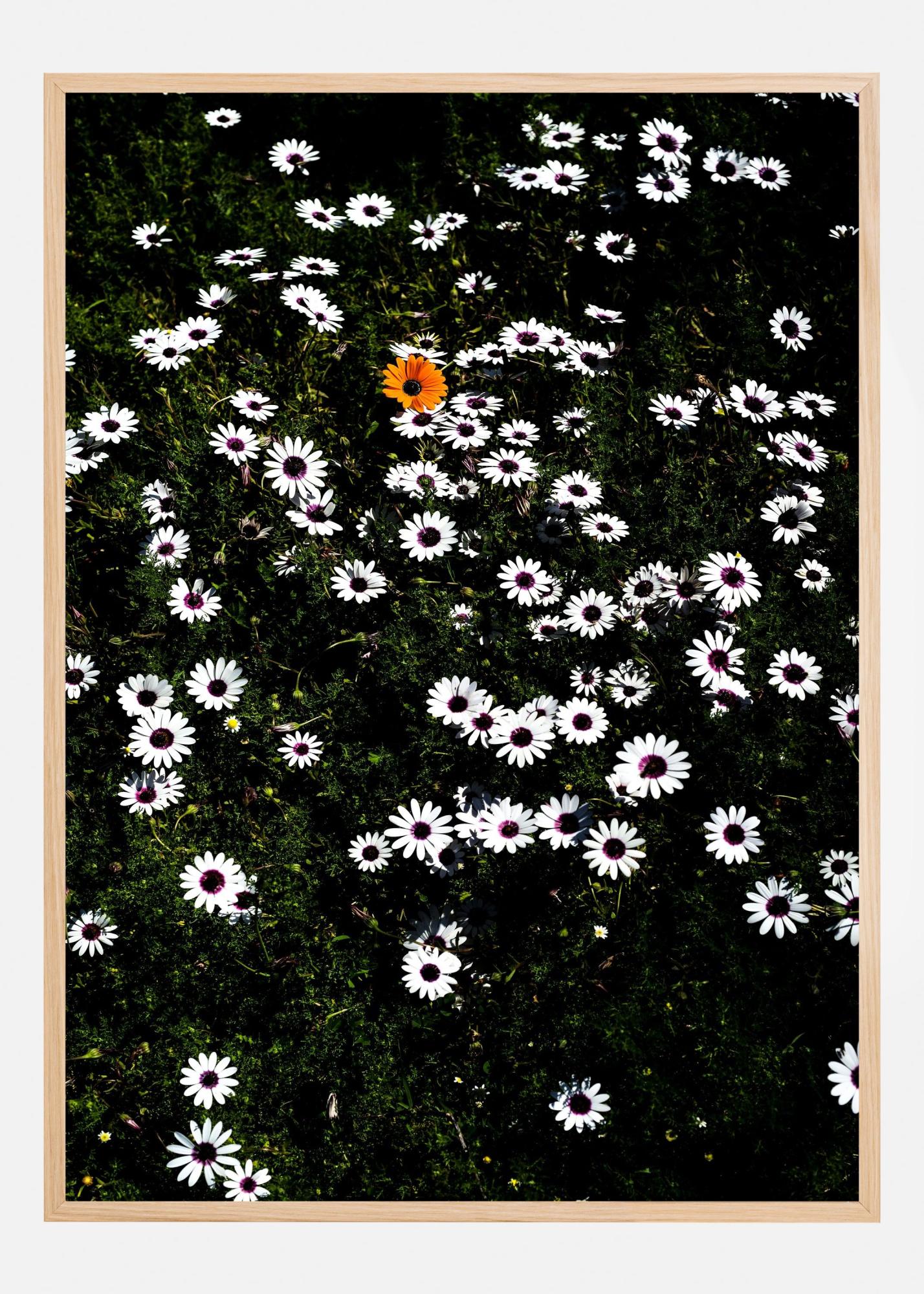 Den här vackra postern fångar ett fält av vita prästkragar med kontrasterande lila mittpunkter utspridda över en djupgrön bakgrund. Mitt i detta hav av vita blommor står en enda lysande orange blomma ut, vilket skapar ett iögonfallande och unikt motiv. Perfekt för att fräscha upp ditt vardagsrum eller arbetsutrymme med en touch av naturens skönhet.