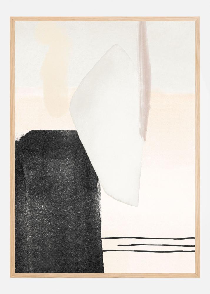 Denna poster fångar en minimalistisk stil med en harmonisk blandning av färger och former. Konstverket domineras av en stor svart rektangulär form som kontrasteras mot mjuka nyanser av beige och vitt. En subtil rosa ton ger en lugnande känsla och skapar en visuell balans i printet.