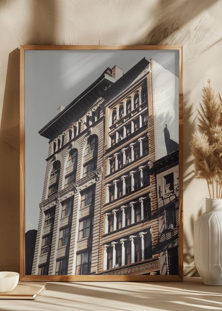 Denna poster fångar stadens arkitektoniska skönhet med sitt fokus på en klassisk byggnadsfasad. Motivets detaljerade utformning framhäver eleganta fönster och dekorativa element som ger en tidlös känsla. Den neutral gråa bakgrunden förstärker fasadens strukturer och skapar en harmonisk balans som passar i både moderna och traditionella inredningar.