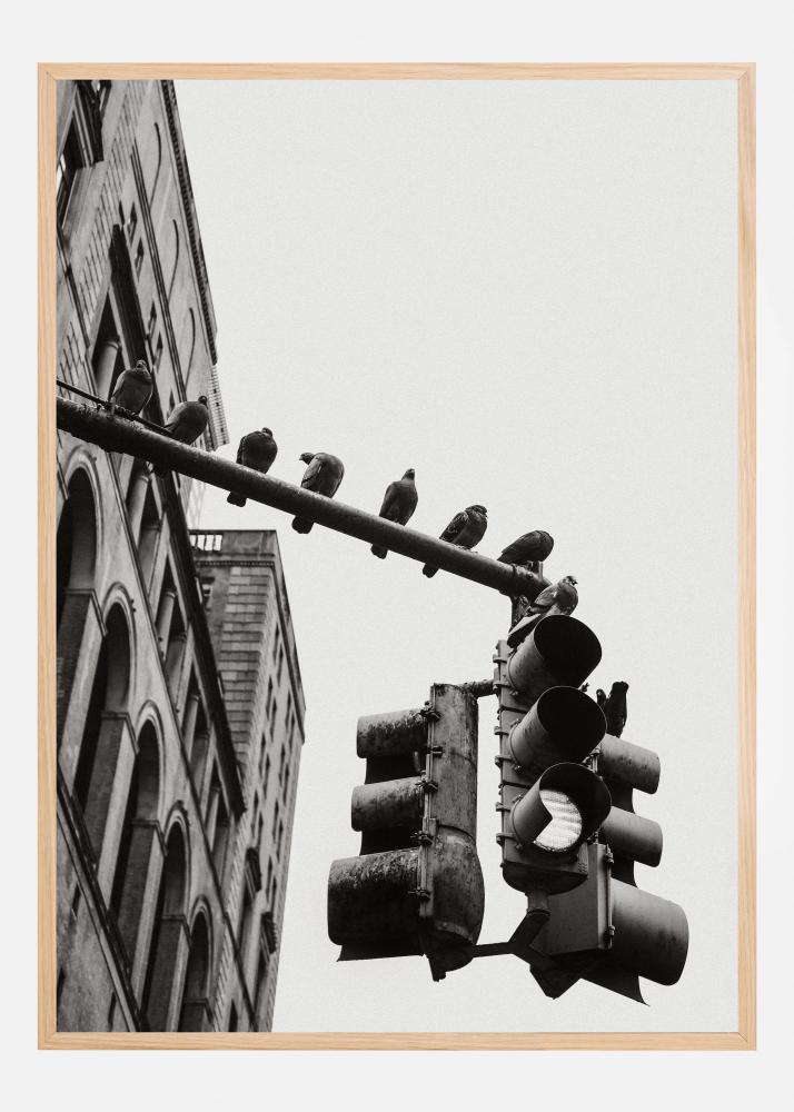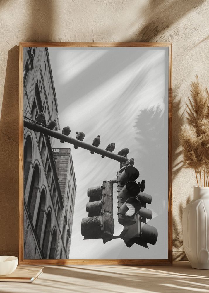Denna stilrena poster föreställer en rad av duvor som sitter på en trafikljusarm, vilket ger bilden en urban och livfull känsla. Motivet är fotograferat i svartvitt, vilket skapar en tidlös och minimalistisk atmosfär. Denna print passar perfekt för den som vill ge sitt hem en modern touch samtidigt som den behåller en klassisk stil. Kombinationen av arkitektur och fåglar ger en intressant kontrast som fångar ögat.