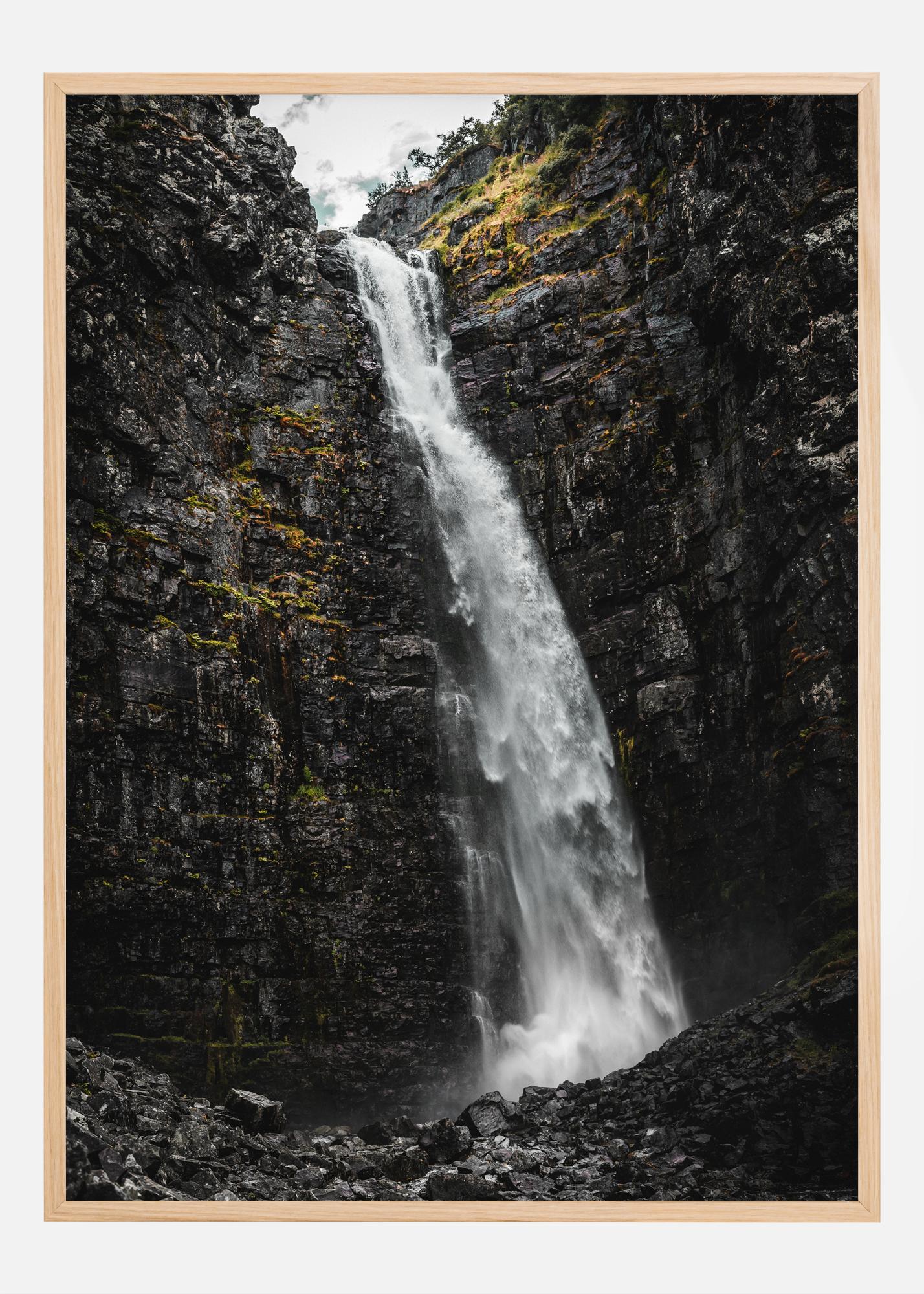 Den här suggestiva postern avbildar Njupeskär, Sveriges högsta vattenfall, som strömmar dramatiskt nedför en stenklädd klippa. Printen visar vattenfallets kraftfulla rörelse och det kalla, klara vattnet som kolliderar med klipporna nedanför. Vattenfallet är omgivet av mörka, nästan svarta klippor, som kontrasterar mot det vita skummet, medan en mjuk grönska klamrar sig fast vid stenarnas ytor. Detta är en affisch som ger en känsla av naturens råa kraft och skönhet och är ett idealiskt tillskott för alla som uppskattar naturens underverk.