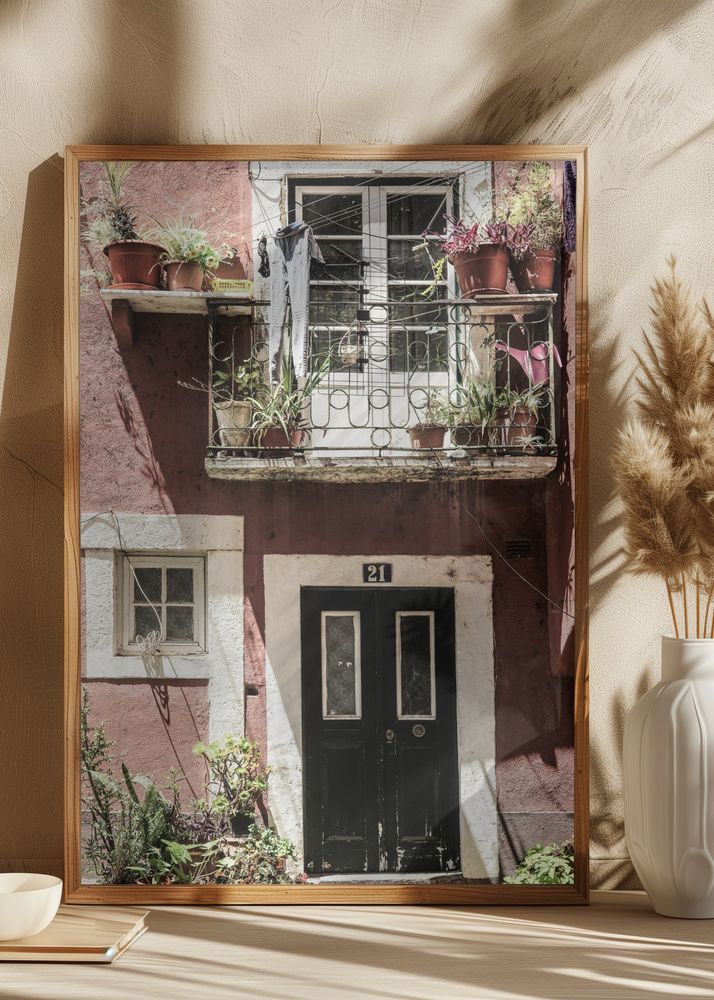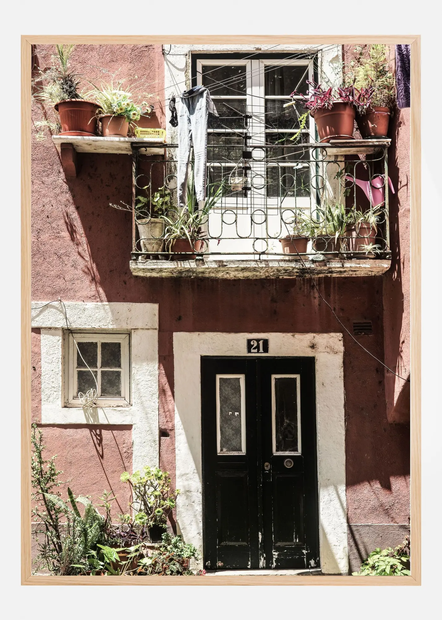 Denna poster fångar charmen av en rustik och färgrik stadsmiljö med sitt motiv av en gammal byggnad och dess levande detaljer. Här syns en vacker balkong prydd med flera krukväxter, vilket ger en känsla av liv och grönska. Den svarta dörren med vita detaljer bildar en stark kontrast mot den vinröda väggen, vilket adderar till bildens djup.